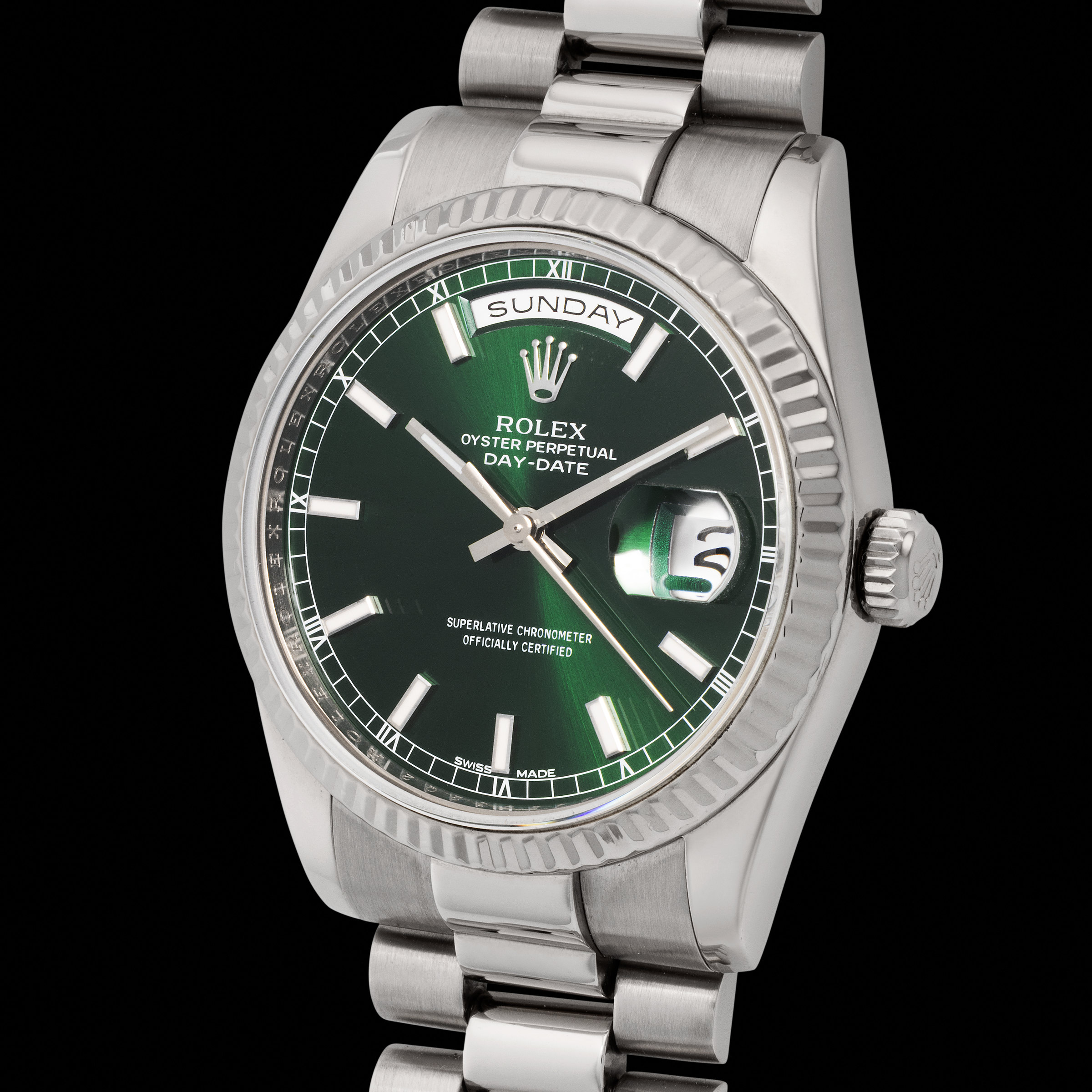 106 Rolex A sporty and lavish, Day-date automatic wristwatch in white gold, with sun-burst green dial and guarantee, reference 118239.