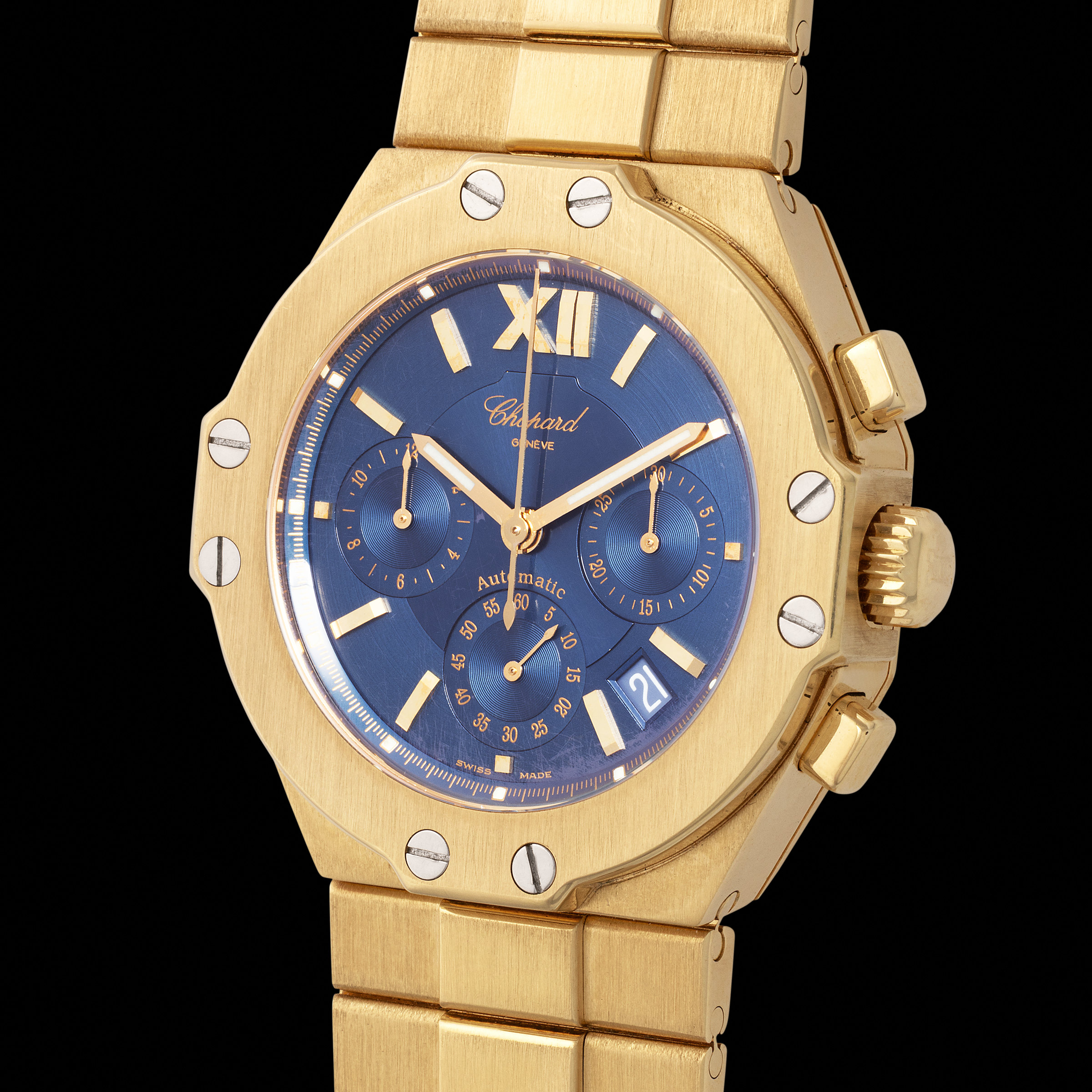 This specific example elevates the original vision to its highest expression, being crafted entirely in yellow gold and housing an automatic chronograph movement—the legendary Caliber 1185, one of the thinnest automatic chronograph calibers ever made. The solid gold integrated bracelet and screwed bezel reflect a sporty yet refined presence, while the electric blue dial—a more attractive configuration—adds a level of richness and charisma rarely seen on the market.