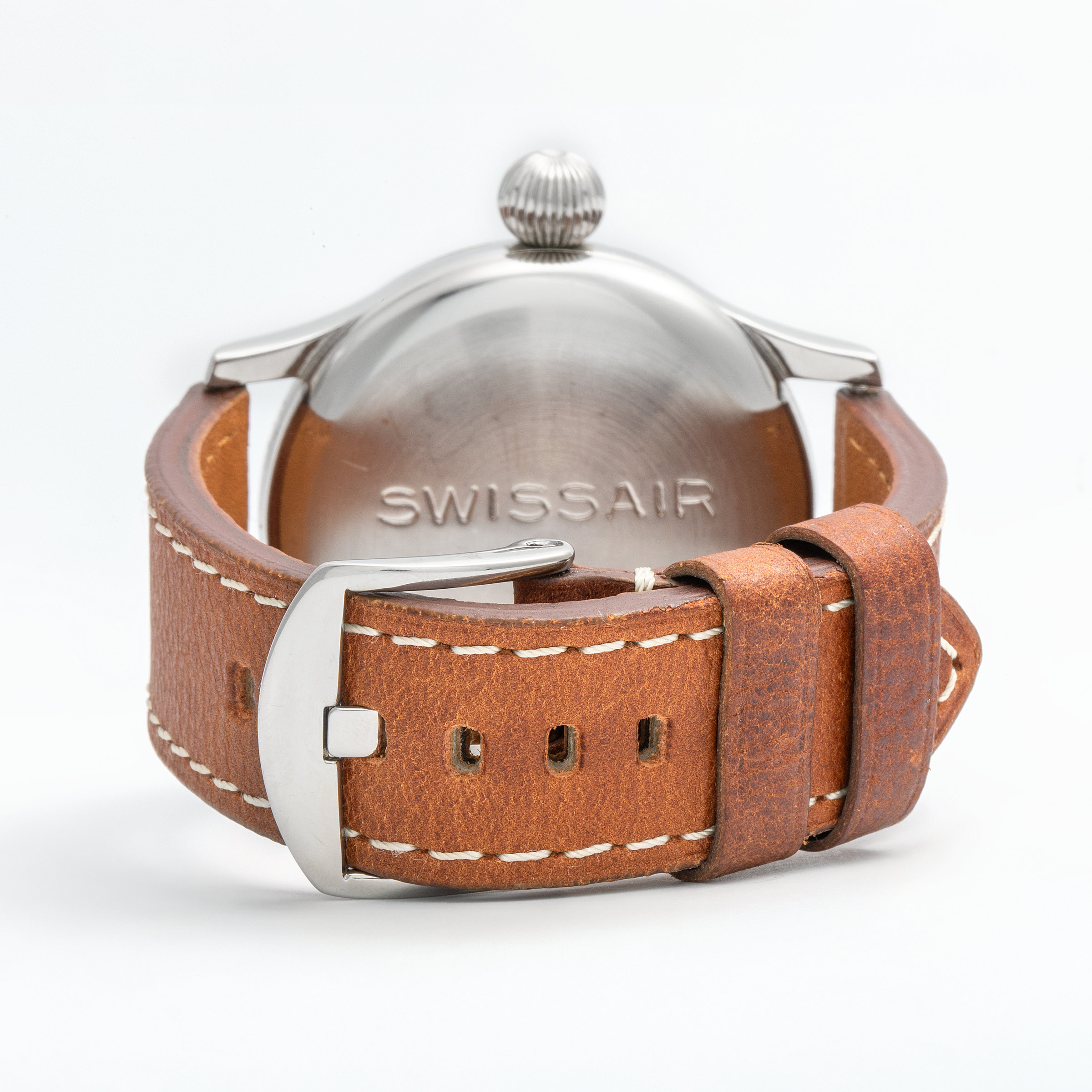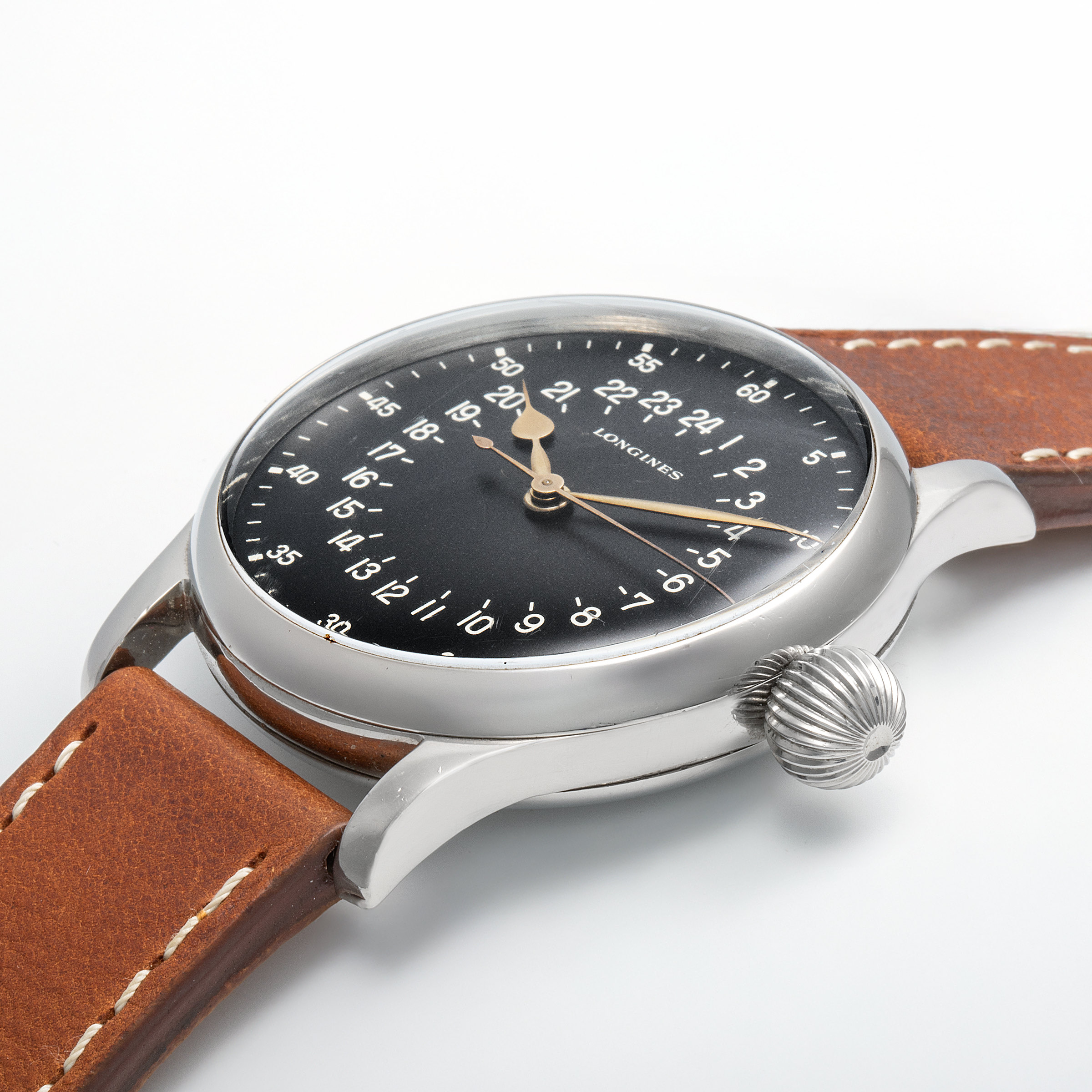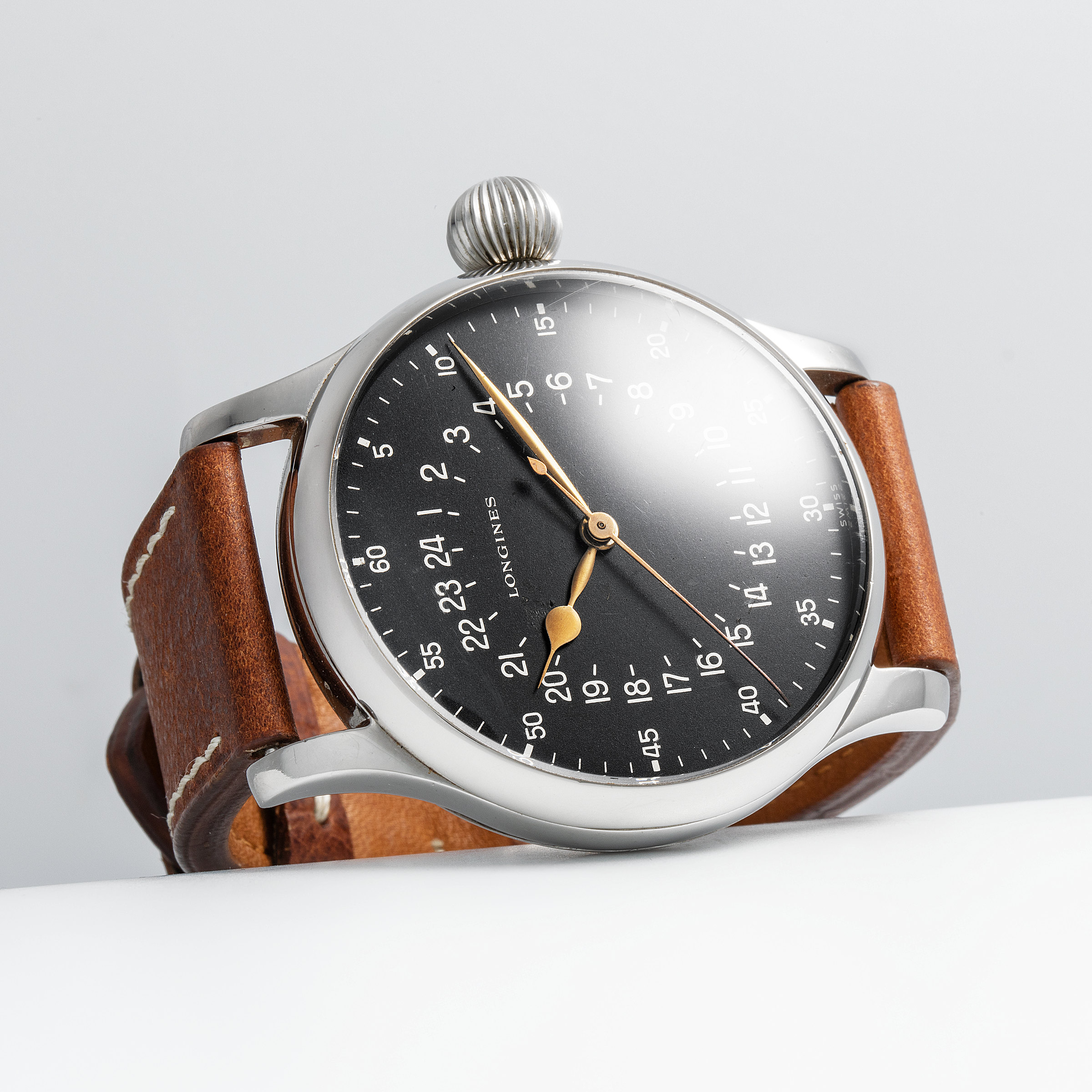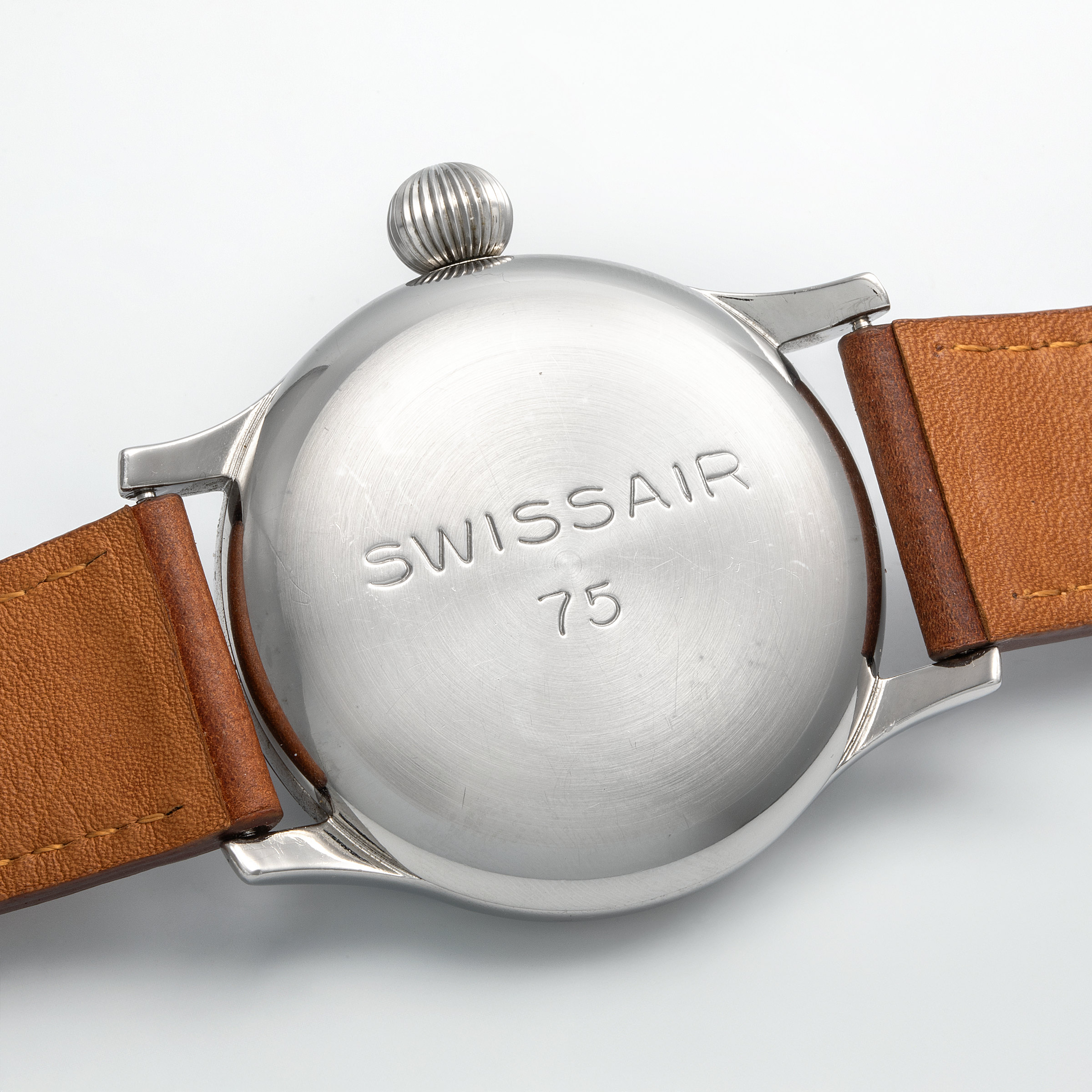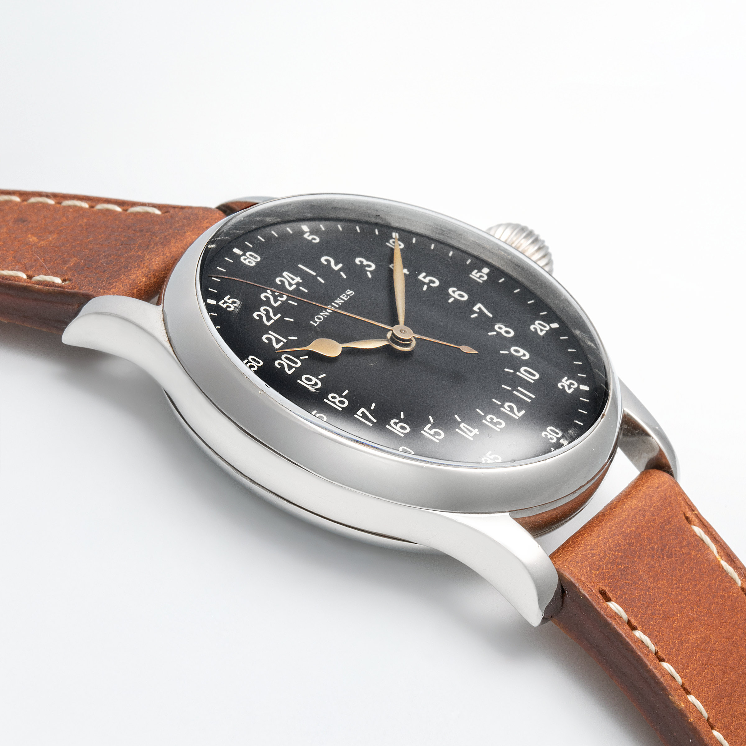 In the golden age of aviation—the 1950s, when commercial flight was rapidly transforming from a luxury into a global norm—a handful of manufacturers rose to meet the technical demands of this new frontier. Among them stood Longines, chosen by Swissair to develop a purpose-built tool watch for its flight crews. Not merely a commercial reference later adopted by professionals, this was a watch born from a direct commission. With a robust, oversized steel case, an easily gripped onion crown, and a stark 24-hour dial for precise legibility at high altitude and low light, the result was an object of pure functional poetry. Confirmed by the Longines Extract as having been delivered directly to Swissair—not through a retailer—this timepiece is part of a rare and elite series tailored exclusively for the airline’s cockpit crews. The engraved caseback, proudly bearing the issue number “75,” adds yet another layer of authenticity to its professional pedigree. Remarkably well-preserved, the present example stuns with its untouched integrity—its engraved caseback remains crisp and deeply defined, while the dial reveals only the faintest whispers of age, a testament to decades of careful stewardship. This charming and exceedingly rare exhudes a palpable sense of history, transporting us to an era when form and function danced effortlessly at 30,000 feet.
