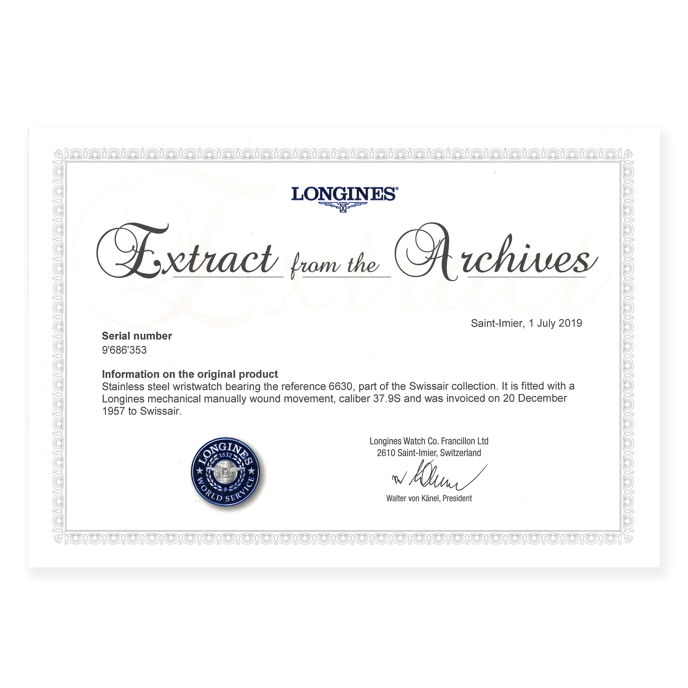- Accessories Accompanied by Longines extract from the archives confirming the sale of the present timepiece on December 20th 1957 to Swissair.