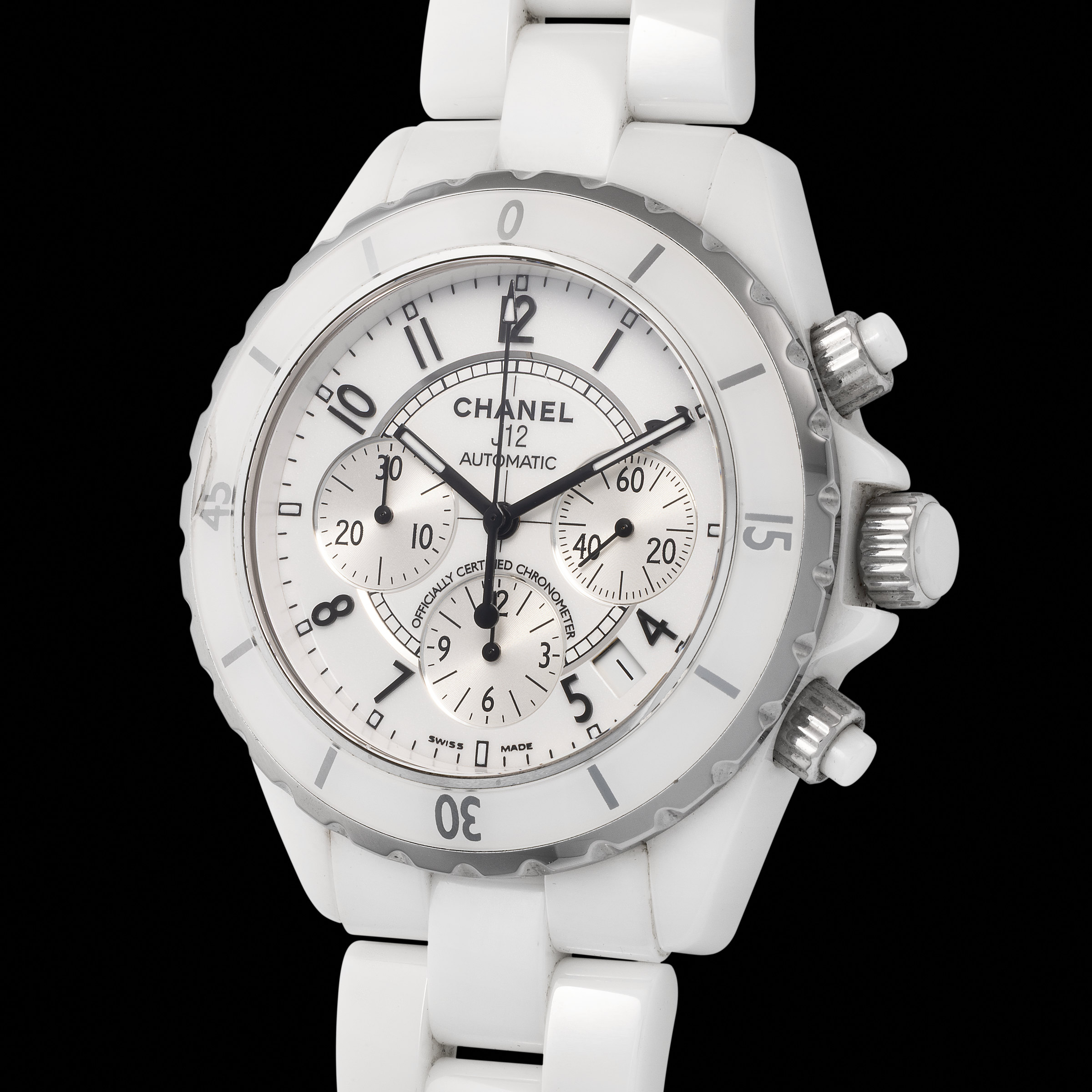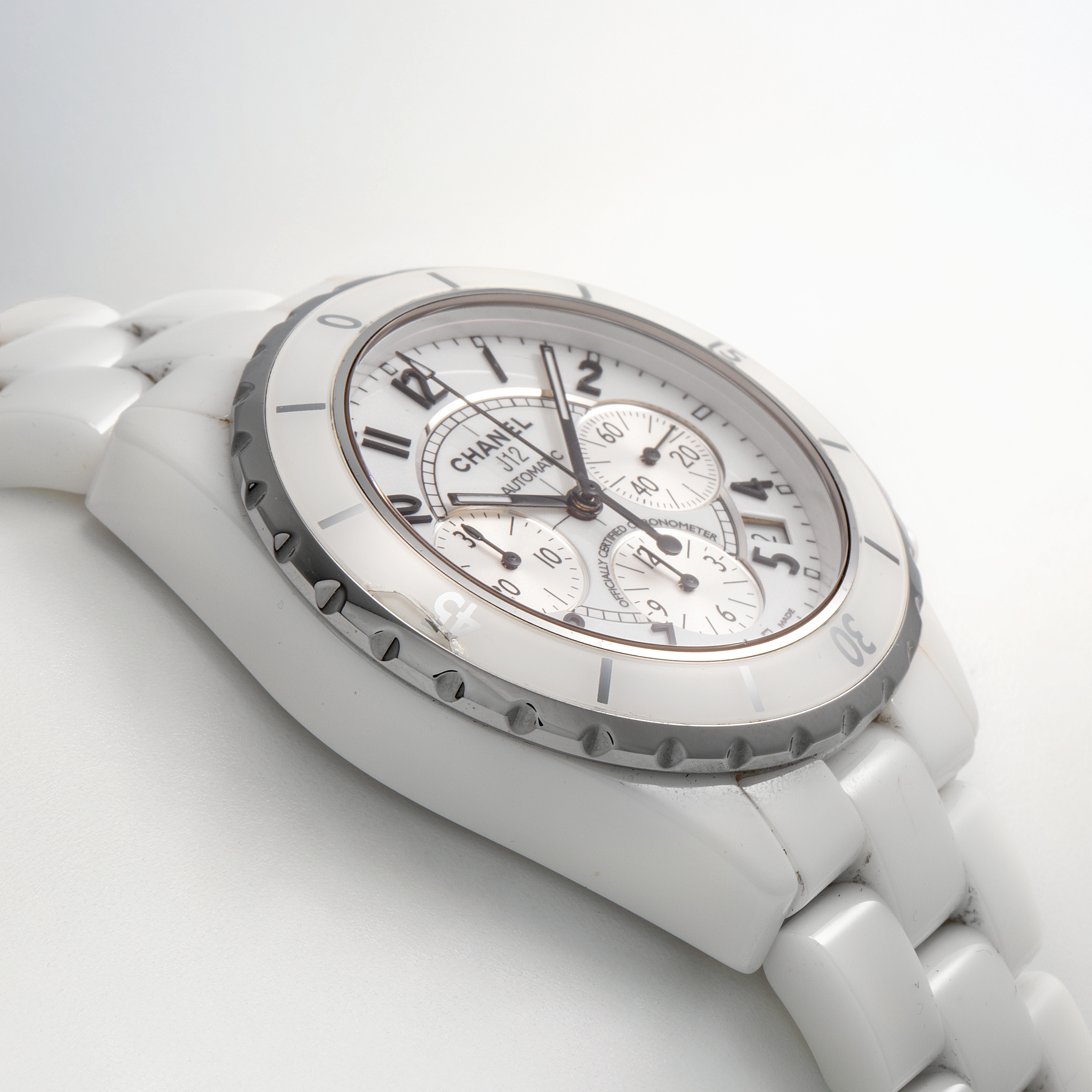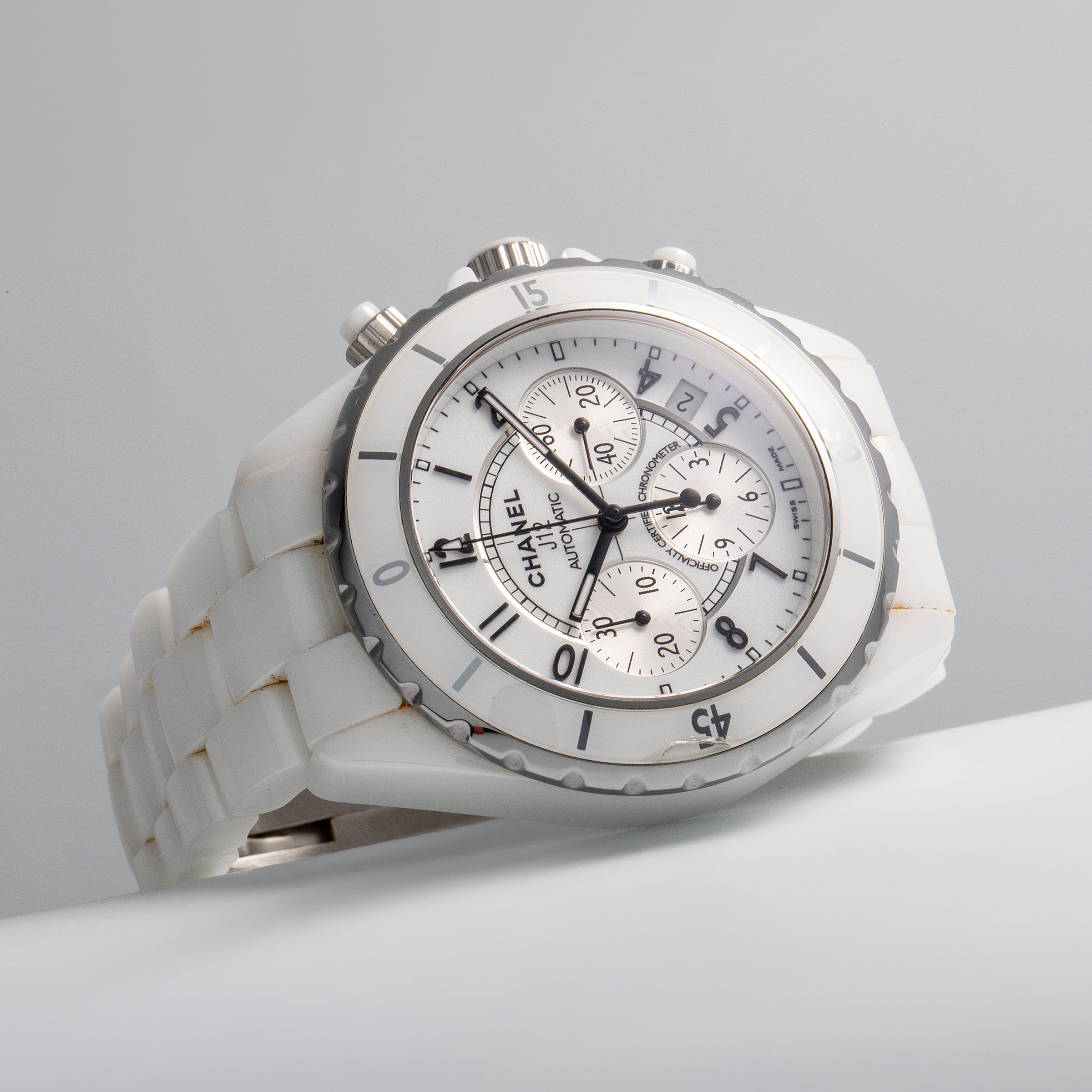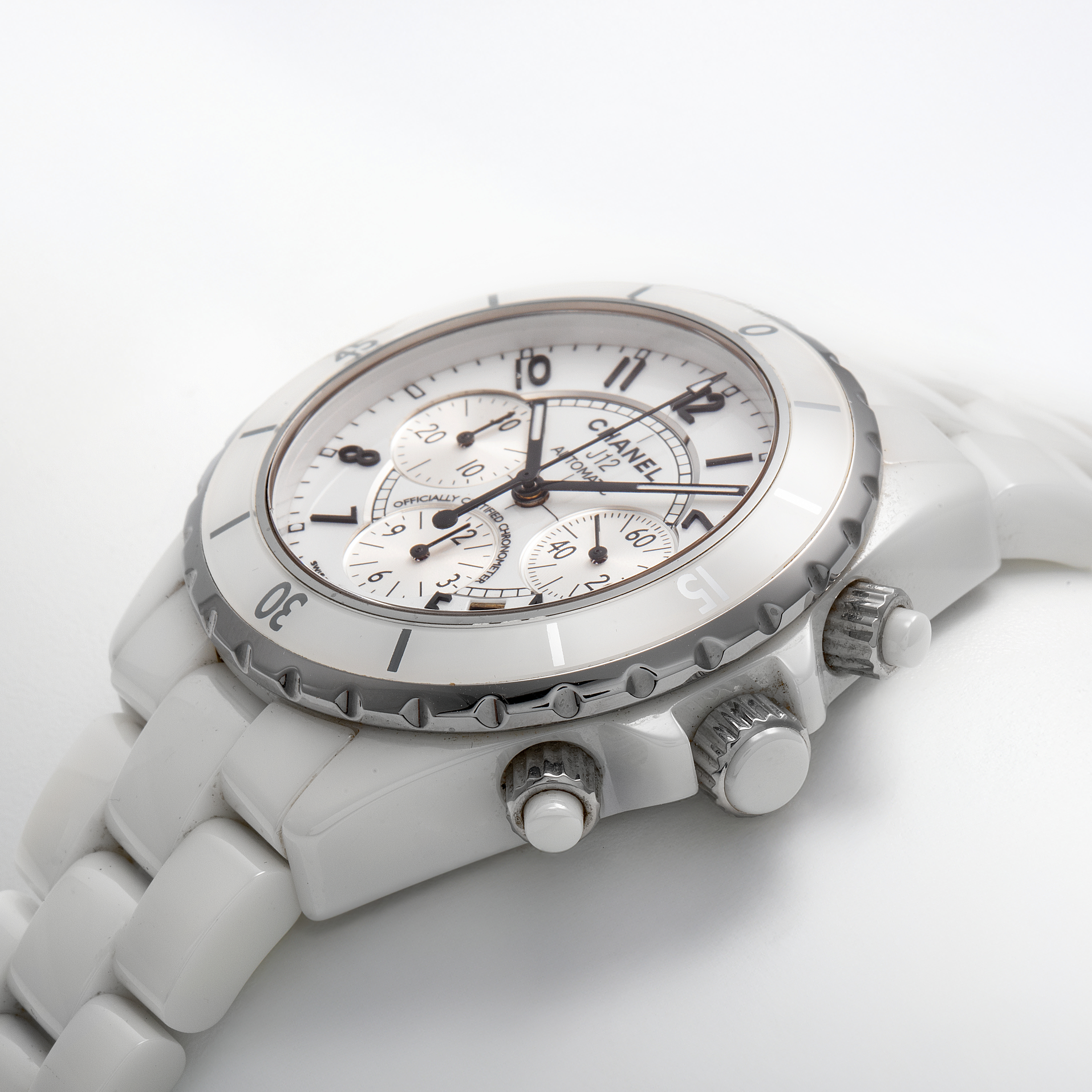 148 Chanel An elegant and attractive, J 12 Chronograph, automatic wristwatch in white ceramic.