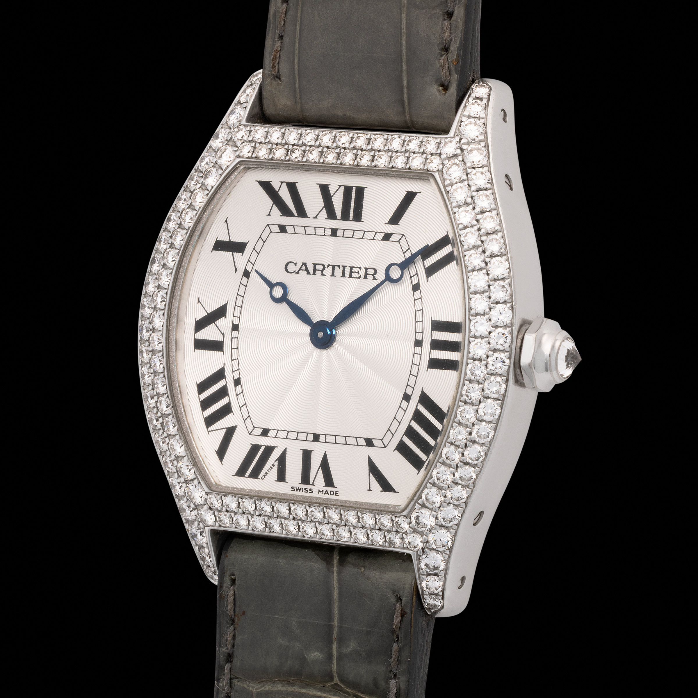 165 Cartier A very attractive and iconic, Tortue, tonneau shape wristwatch in white gold with diamond-set case.