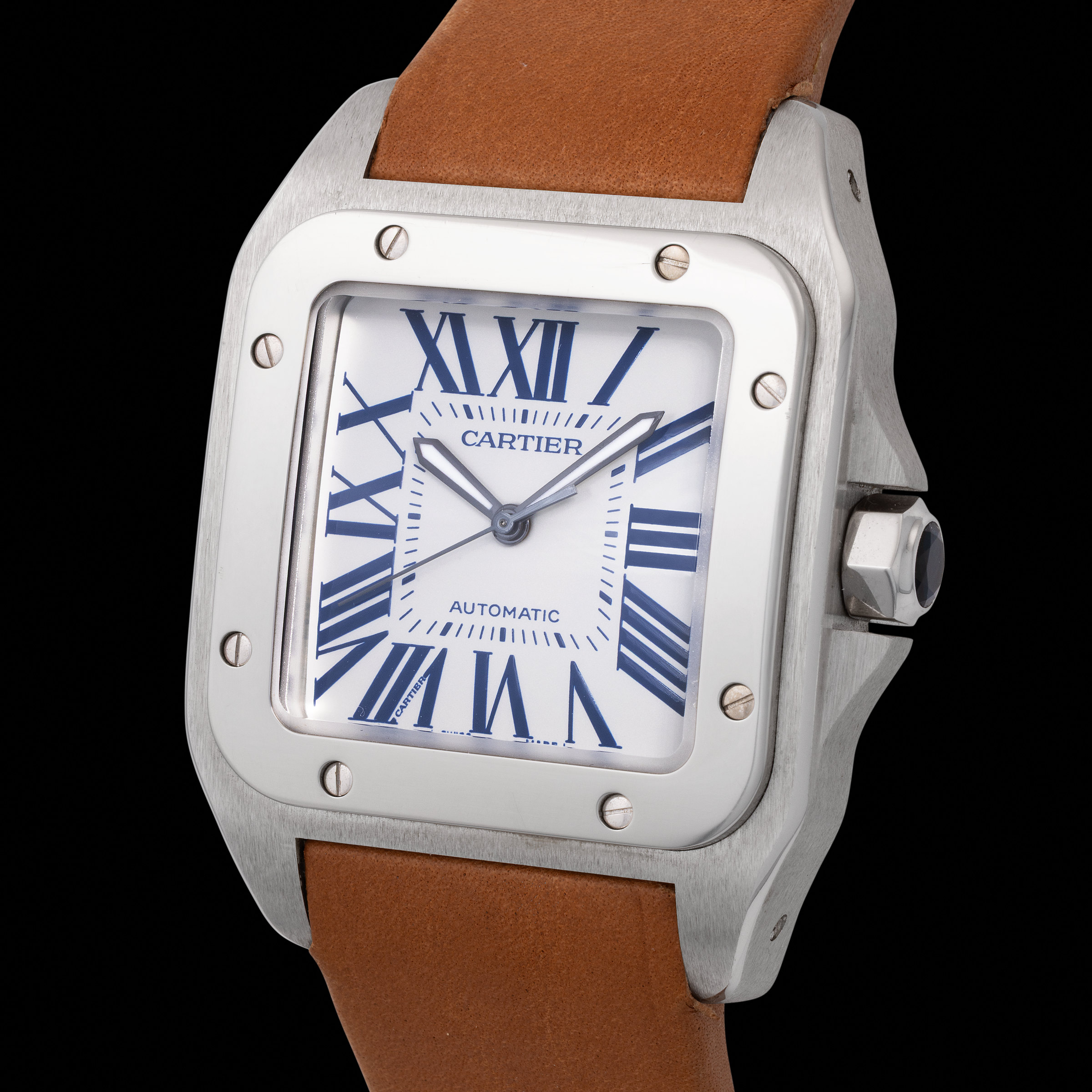 The present example must be considered among the most important Santos 100s known to exist. According to available information, only a handful examples of the Santos 100 XL were ever produced in platinum. This one, even more special, is a special request with a silvered dial and painted blue Roman numerals, distinguishing itself even more through a rare combination of aesthetic refinement and material exclusivity.