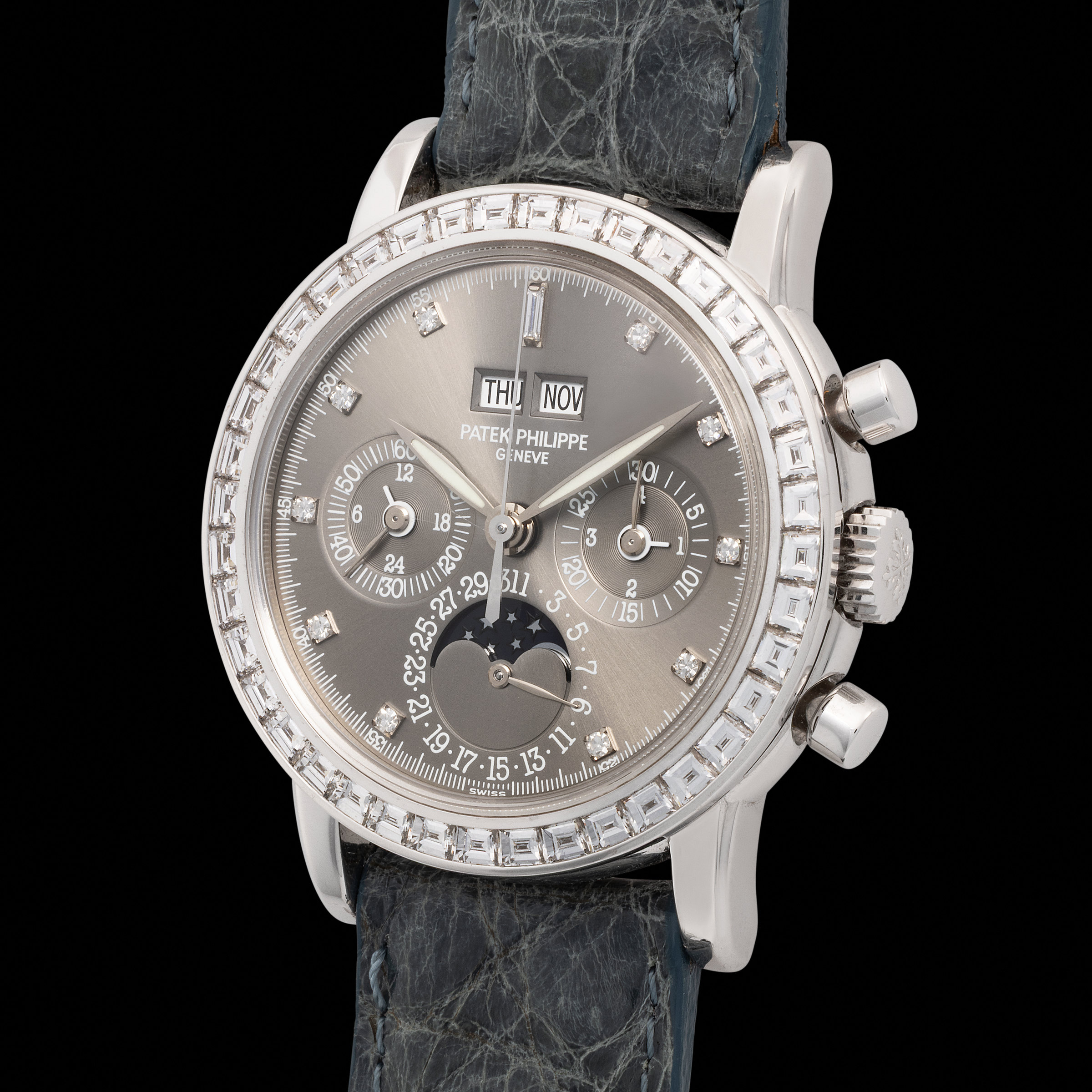 Crafted entirely in white gold, this example bears all the gravitas one expects from Patek Philippe’s grand complications. What truly sets this watch apart, however, is also the dial: a rich grey ardoise tone that exudes sophistication and modernity, where the moonphase at six o’clock seems to float beneath a canopy of diamonds. The dial architecture is harmonious: two apertures at 12 for day and month, and three sunken sub-dials for chronograph and calendar indications, all placed with the precision of a classical composer.
