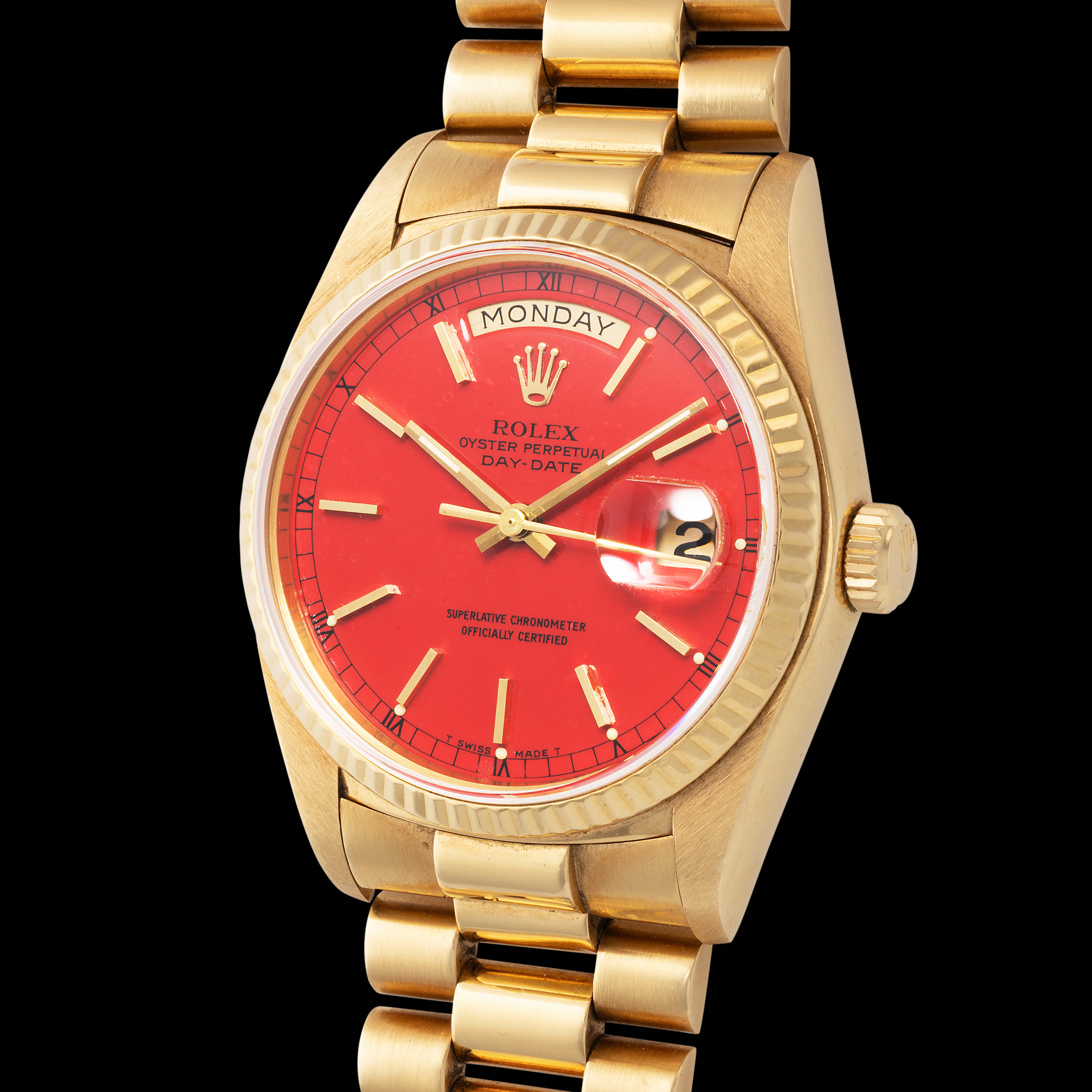 The present Day Date reference 18038, from 1977, is an uncompromising expression of the genre: a watch that juxtaposes the warm opulence of its 18-carat yellow gold case with the arresting intensity of a coral-red lacquer dial that practically glows from within.