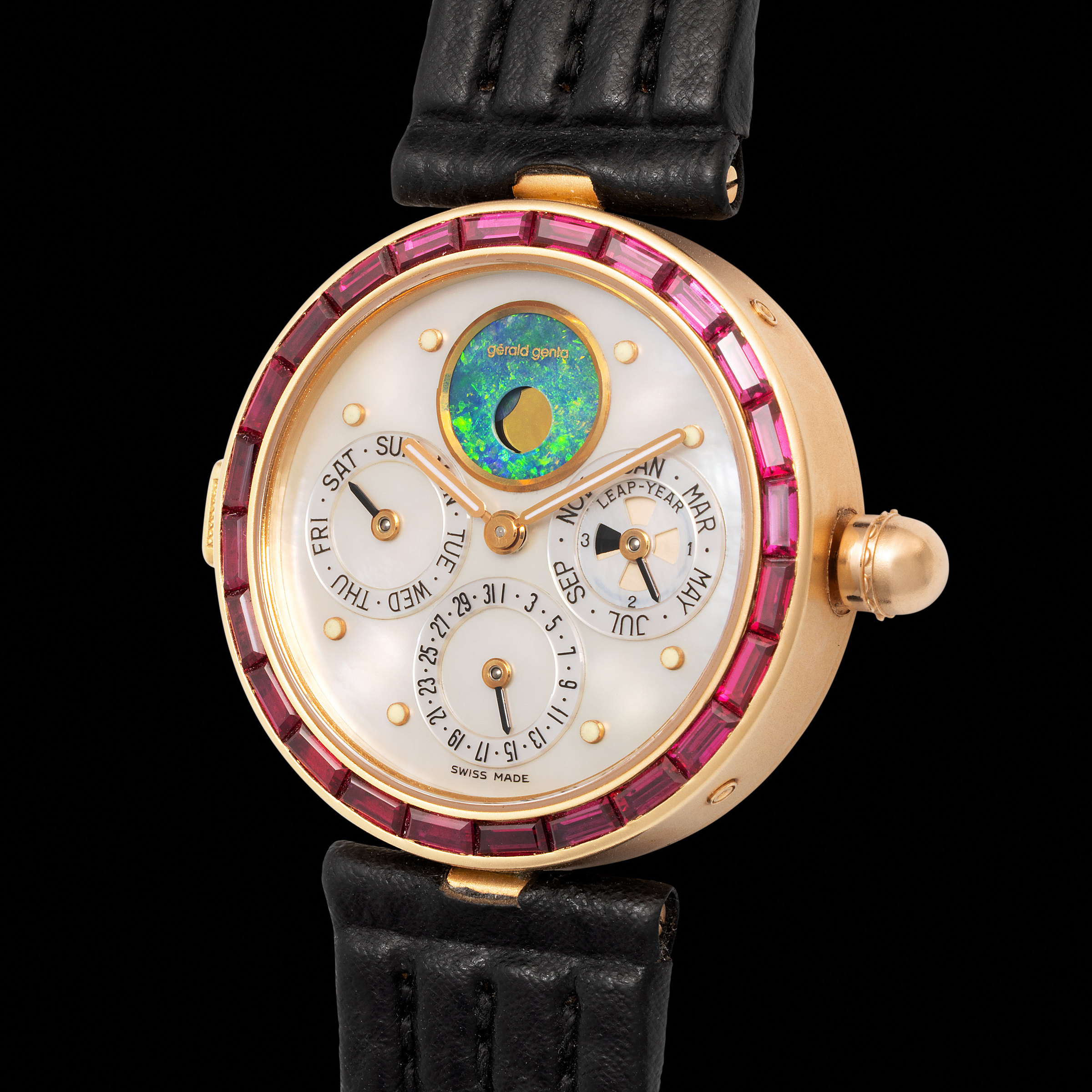 It is in this spirit that we encounter this extraordinary Gérald Genta Minute Repeater, reference G.4011.4. In an era often dominated by conventional aesthetics, this timepiece stands apart as a masterwork of both horological and lapidary artistry. The case, executed in a warm and luminous sandblasted pink gold, presents a classic round silhouette, yet it is anything but simple. The bezel is a breathtaking mosaic of calibrated, baguette-cut rubies, their rich, crimson hue offering a striking and luxurious contrast to the soft tone of the gold. This meticulous stone-setting transforms the watch into a piece of high jewelry. The dial itself is a spectacle of precious materials and high-level complications. A radiant mother-of-pearl plate forms the backdrop, its iridescent sheen playing with the light. Set against this canvas are the beautifully balanced sub-dials of the perpetual calendar, displaying the day of the week, the month and leap year cycle, and the date. At the twelve o'clock position, a magnificent moonphase disc is revealed, not as a simple painted element, but as a mesmerizing piece of natural opal, its vibrant, organic patterns providing a unique and artistic focal point. The true heart of this watch, however, is a minute repeater, a highly coveted and technically complex complication, which, when activated, sounds the time on demand with a delicate and enchanting melody. This rare and exquisite timepiece with rare pink gold movement, is not merely a watch; it is a wearable sculpture, a flamboyant expression of Gérald Genta's boundless imagination and a testament to the golden age of haute horlogerie.