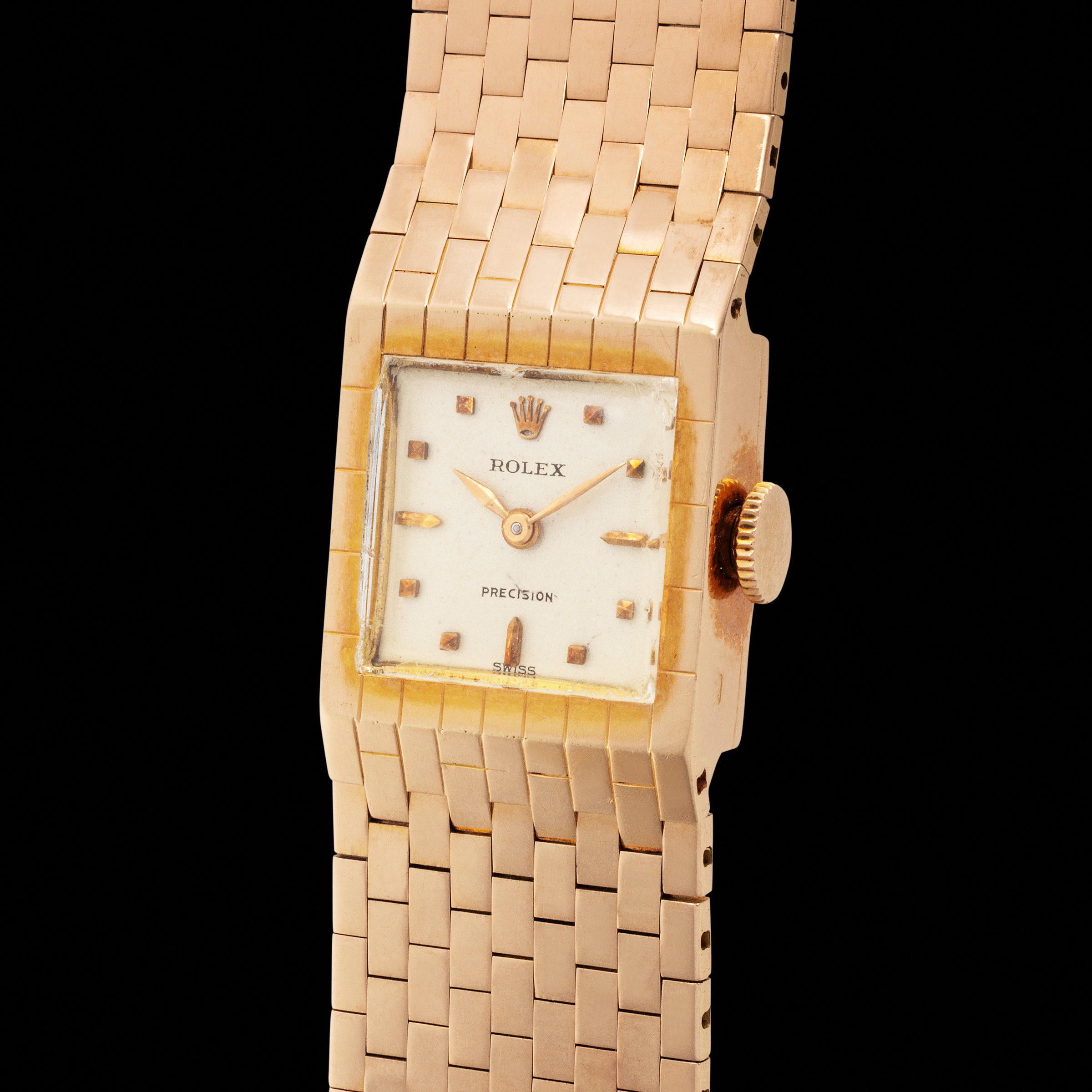 Rolex, celebrated for its perfect balance of precision, design, and sophistication, has long set the standard for luxury watchmaking. Though primarily known for its durable, high-performance tool watches, Rolex has also crafted timepieces that marry technical mastery with exquisite jewelry artistry. Over the years, the brand unveiled select models that reflect a more refined elegance, incorporating precious metals, like the present example, to elevate their exclusivity and allure. The present Rolex Precision reference 8208 takes inspiration from the elegance of a belt, featuring an integrated bracelet with a brick-link pattern that seamlessly flows into the engraved bezel, with the clasp mimicking the look of a belt buckle. The present timepiece from the 50s, transcends being just a watch, it's more akin to a luxurious bracelet. Beautifully preserved, its individual number as well as the Rolex coronet are still visible to the caseback. The creamy white dial is complemented by 18k gold applied markers and alpha hands, exhuding an overall sense of refinement and elegance. Highly attractive, one of the most striking features is the 18k pink-gold buckle, adding an extra touch of elegance.