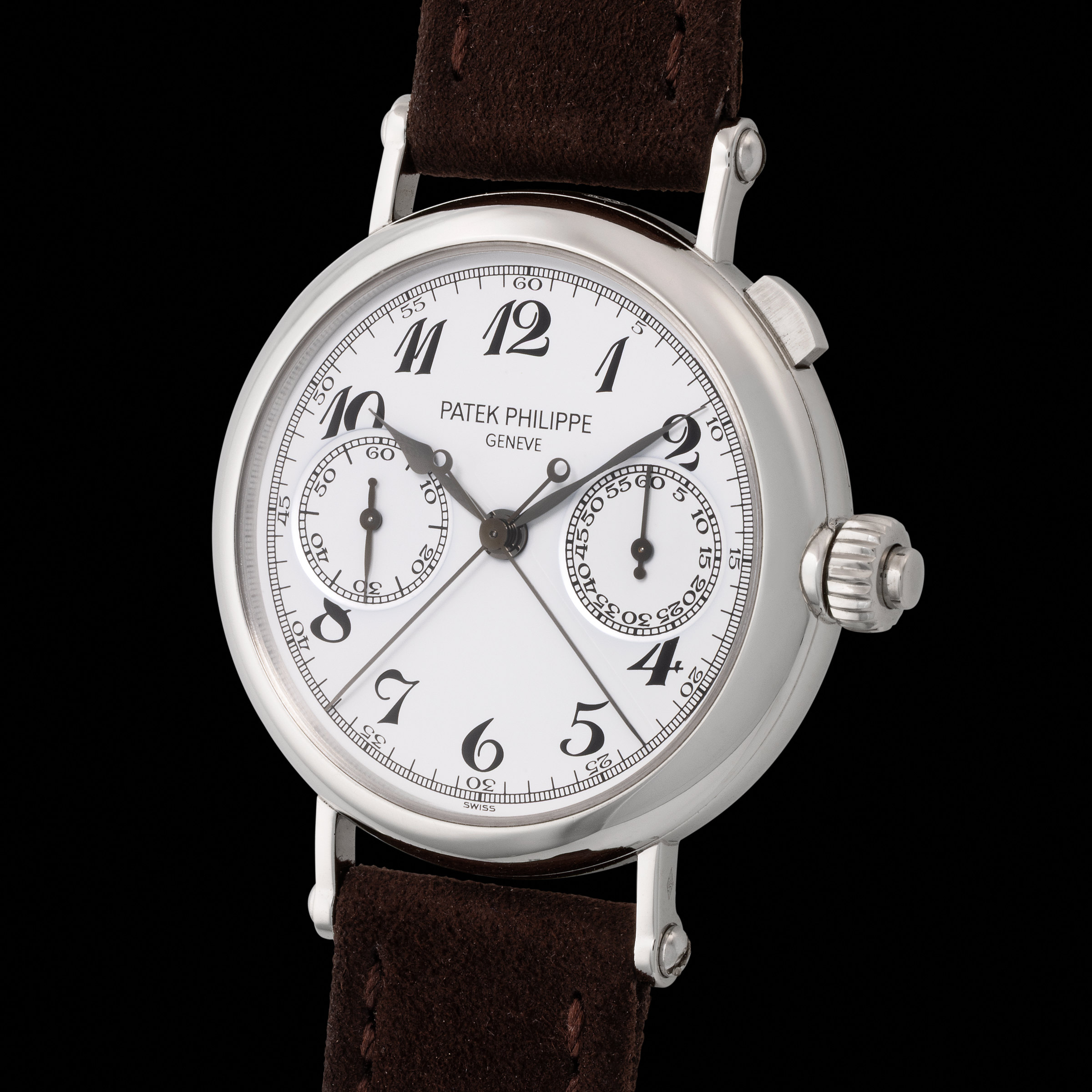 266 Patek Philippe An exceptional, rare and very fine, split-seconds manual chronograph wristwatch in platinum, with white lacquered dial and Breguet numerals, certificate of origin and leather folio, reference 5959P.