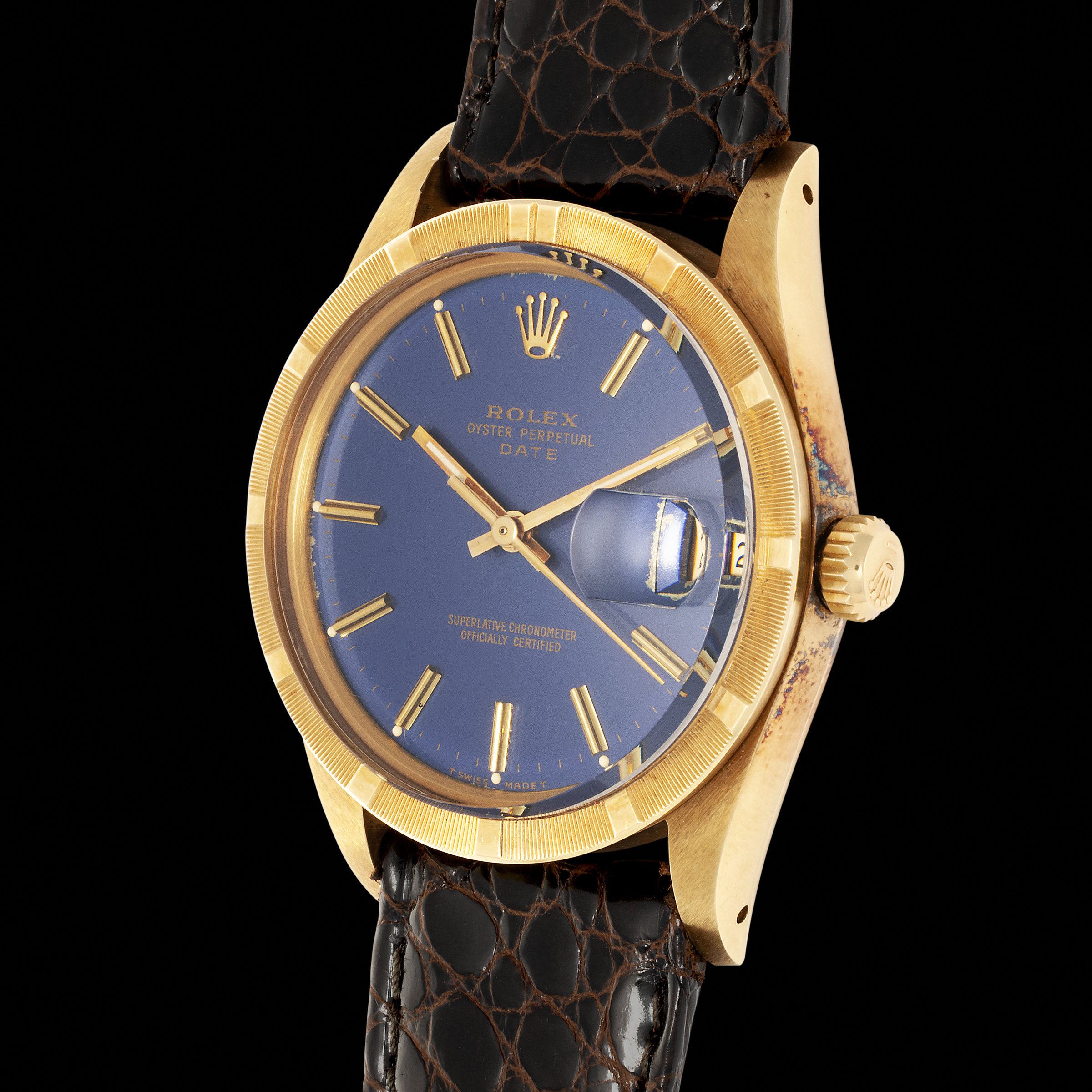 55 Rolex An extremely well preserved and attractive, Oyster Perpetual Date, automatic wristwatch in yellow gold, with blue dial, "Thunderbid" bezel and caseback sticker, reference 15018.