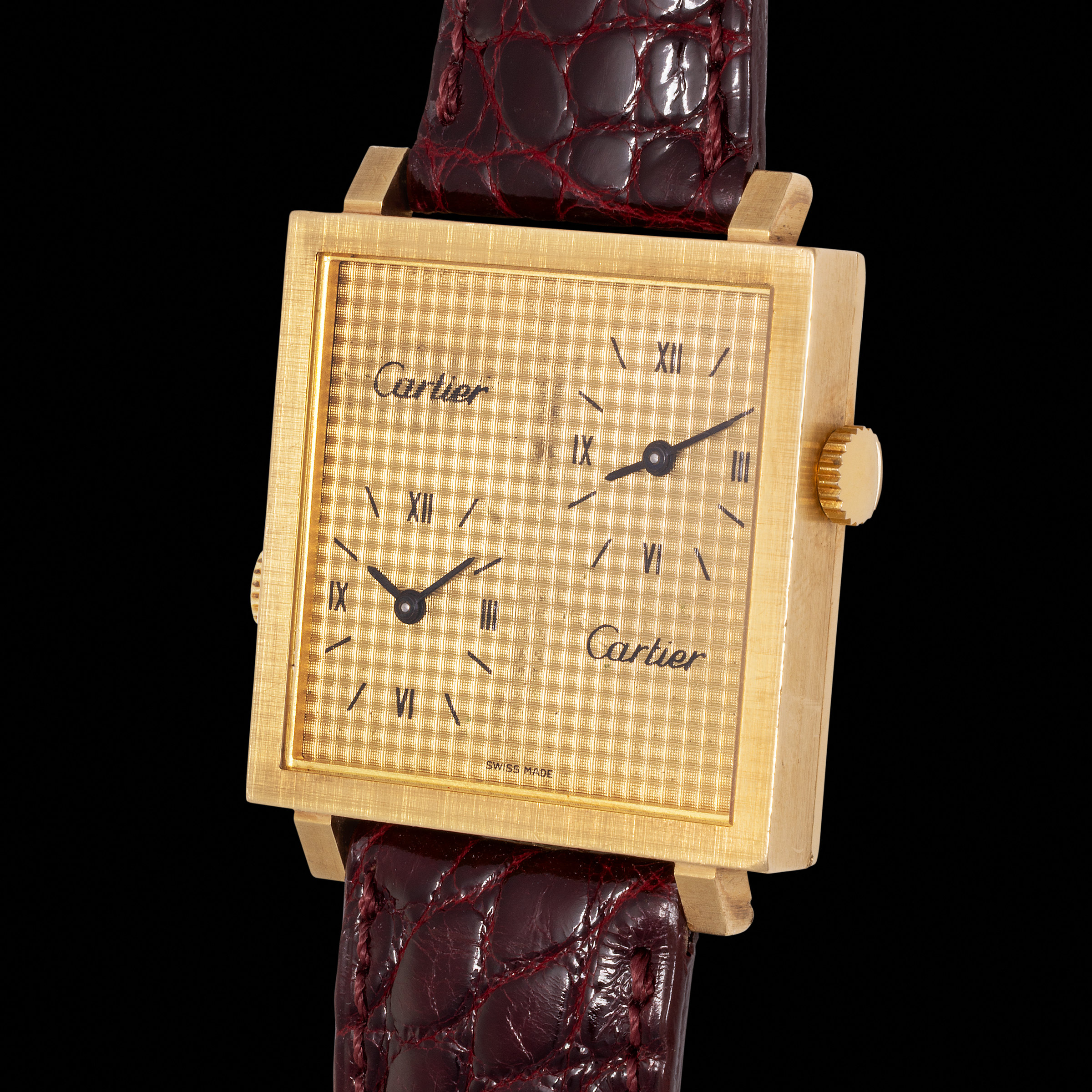 In the world of haute horlogerie, few names can rival Cartier’s legacy for blending tradition with innovation, elegance with utility. The watch here offered is a fascinating example of this ethos: a rare dual-timepiece that combines the refinement of Cartier with a surprisingly functional twist. Unlike most Cartier models, this particular timepiece features a design that’s both distinctive and practical, marking a striking departure from the brand’s more traditional offerings. Produced in the early '90s, this watch represents a period of transition for Cartier, as it was being redefined under the Vendôme Luxury Group, which had acquired controlling shares of both Piaget and Baume & Mercier. This partnership enabled Cartier to take on a wider array of sophisticated mechanisms, including the movement housed in this very watch: a Baume & Mercier cal. BM550. The elegant square-shaped case also signed Baume & Mercier, crafted from yellow gold, is complemented by two distinct dials, each controlled by an individual crown, making this timepiece a standout for both its utility and aesthetic. The dials are signed "Cartier," featuring Roman numerals and a spectacular guillochè decoration that lend it a timeless charm. It’s no wonder that this rare design is an uncommon gem among Cartier's range, with few examples ever reaching the market. With its clean lines, special dual-dial design, and history behind its movement, this Cartier Dual-Time is a rare opportunity for collectors and admirers of the Maison’s fine craftsmanship.
