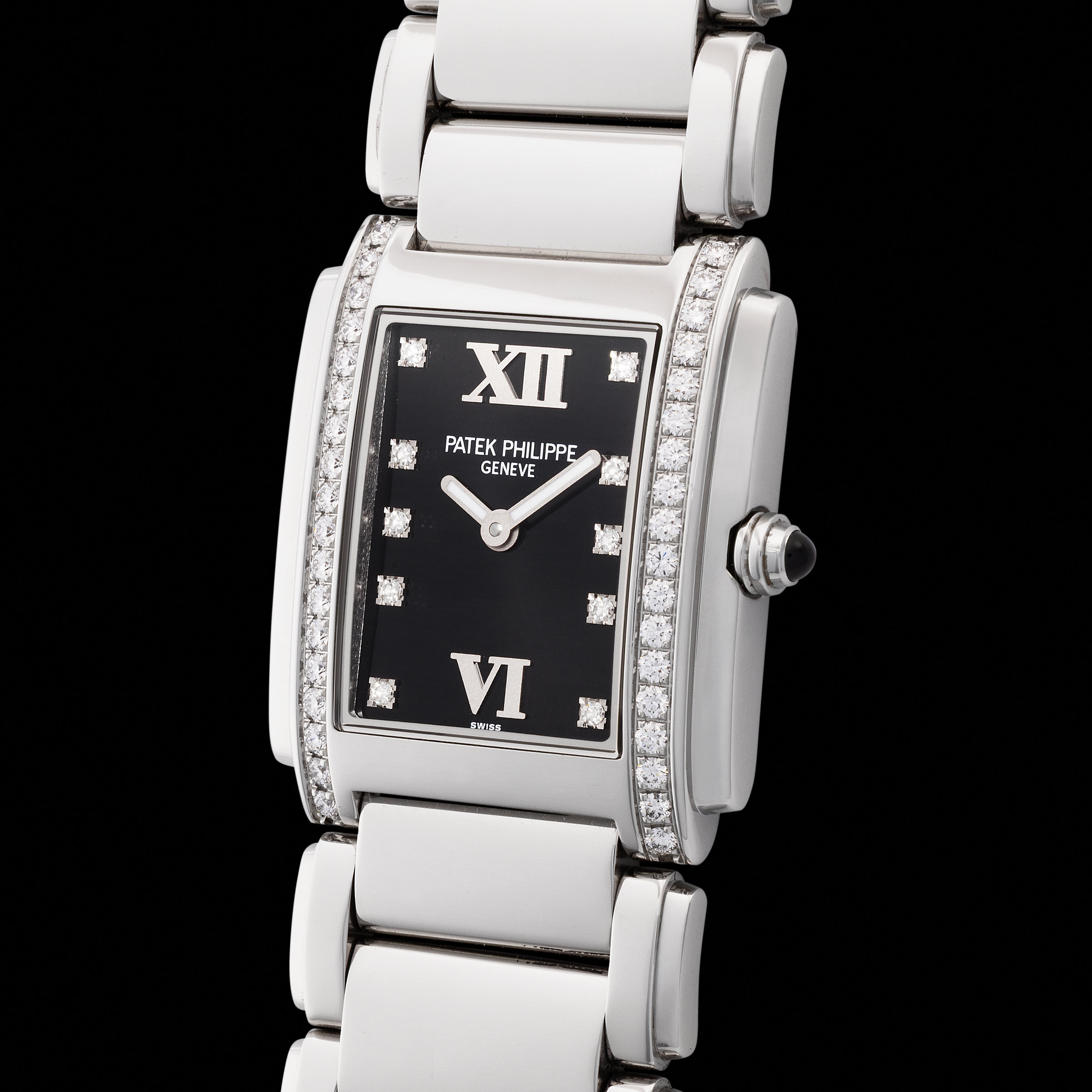 74 Patek Philippe A fine and elegent, Twenty-4, lady’s wristwatch in steel, with diamond-set bezel and dial, box and warranty, reference 4910.