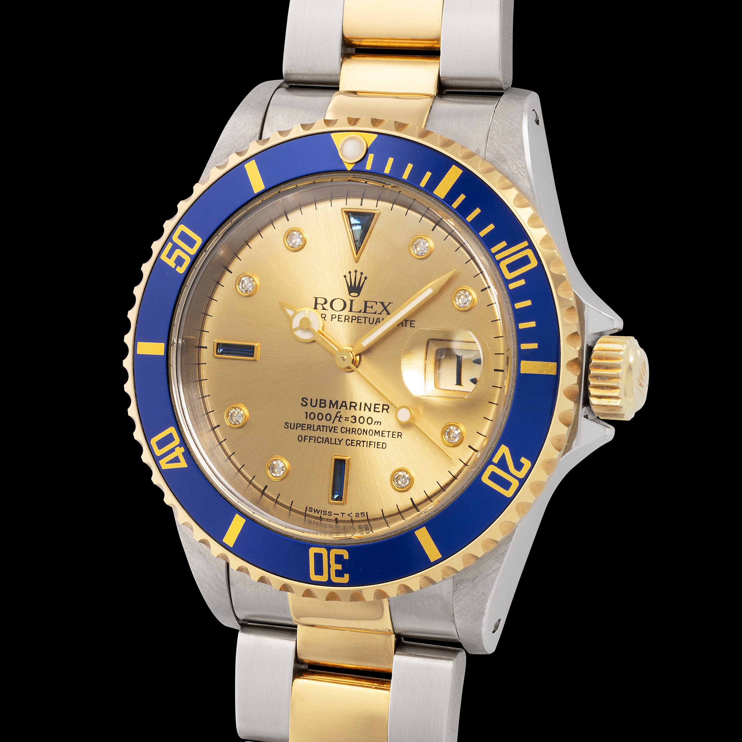 79 Rolex An attractive and iconic, Submariner, automatic wristwatch in steel and yellow gold, with “Sultan” diamond and sapphire-set indexes dial and guarantee, reference 16613.
