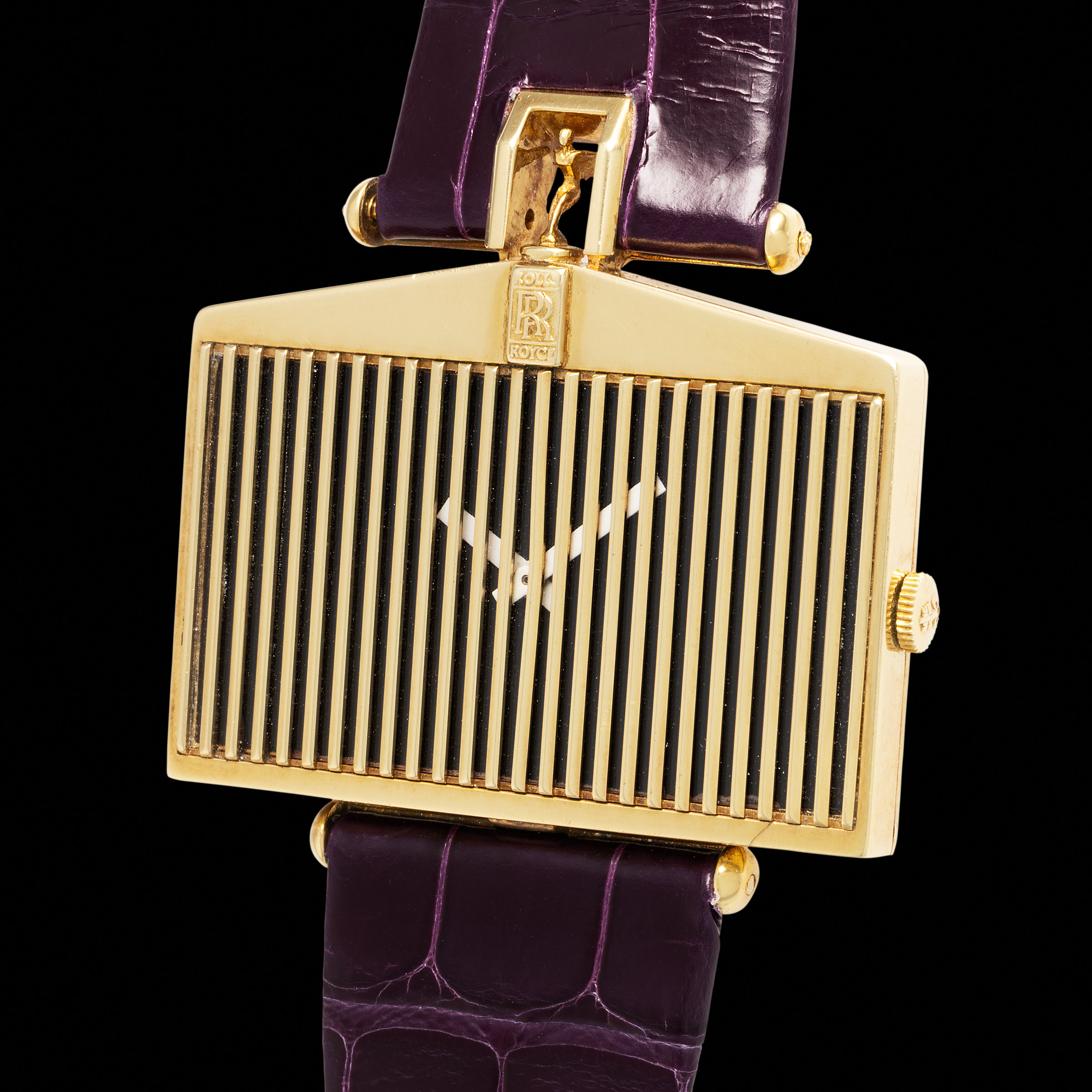 Crafted in 18k yellow gold, this remarkable piece transforms the unmistakable front grille of the Rolls-Royce into a wearable sculpture. The vertically fluted façade is crowned by the legendary double "RR" emblem and flanked by an exquisite miniature of the “Spirit of Ecstasy”—not merely an aesthetic flourish, but a functional, sculptural link between case and strap. The result is a watch that pays tribute to craftsmanship in both mechanics and design.