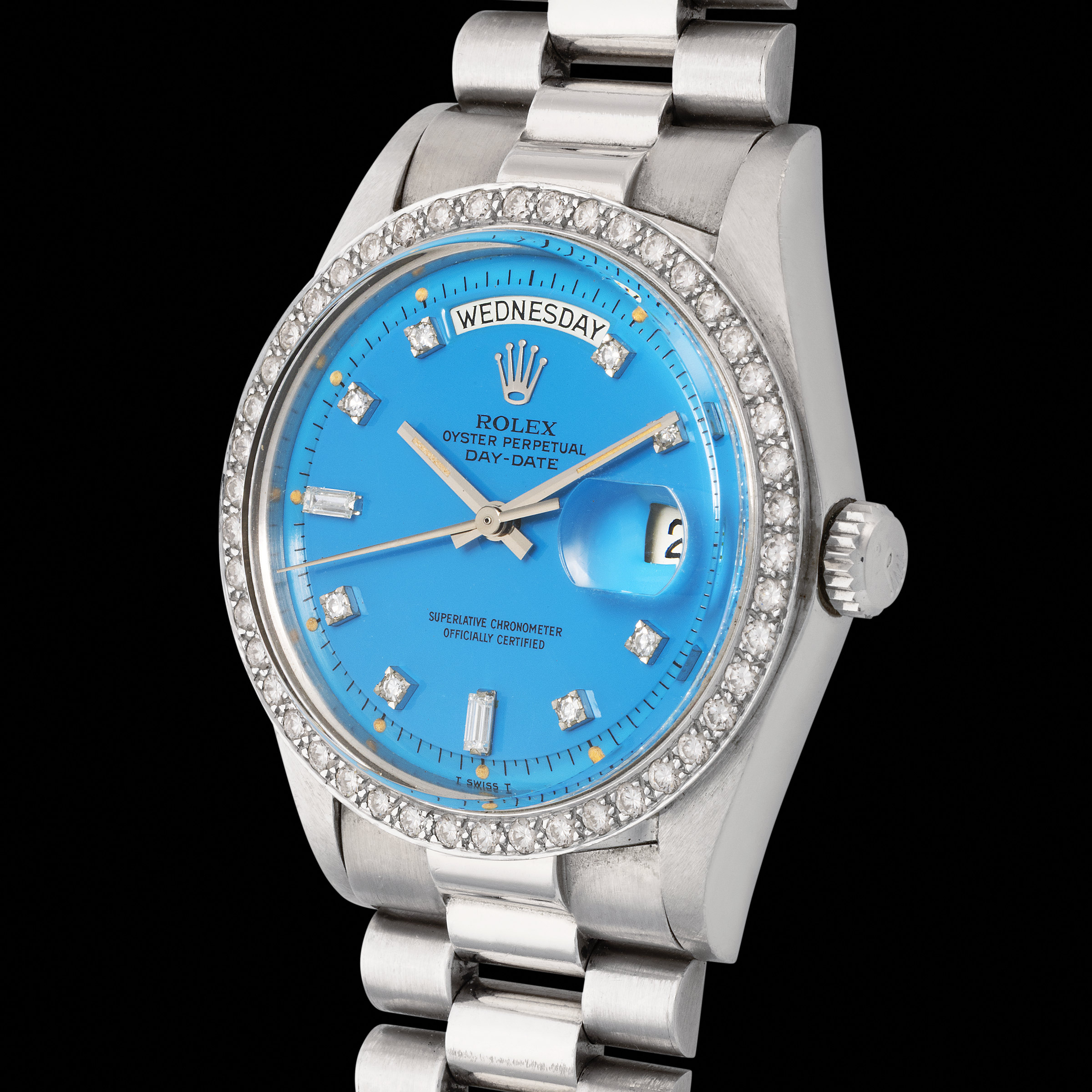 130 Rolex A precious and rare, Day Date, automatic wristwatch in platinum, with light-blue lacquered "Stella" dial and diamond-set bezel and indexes, reference 1804.
