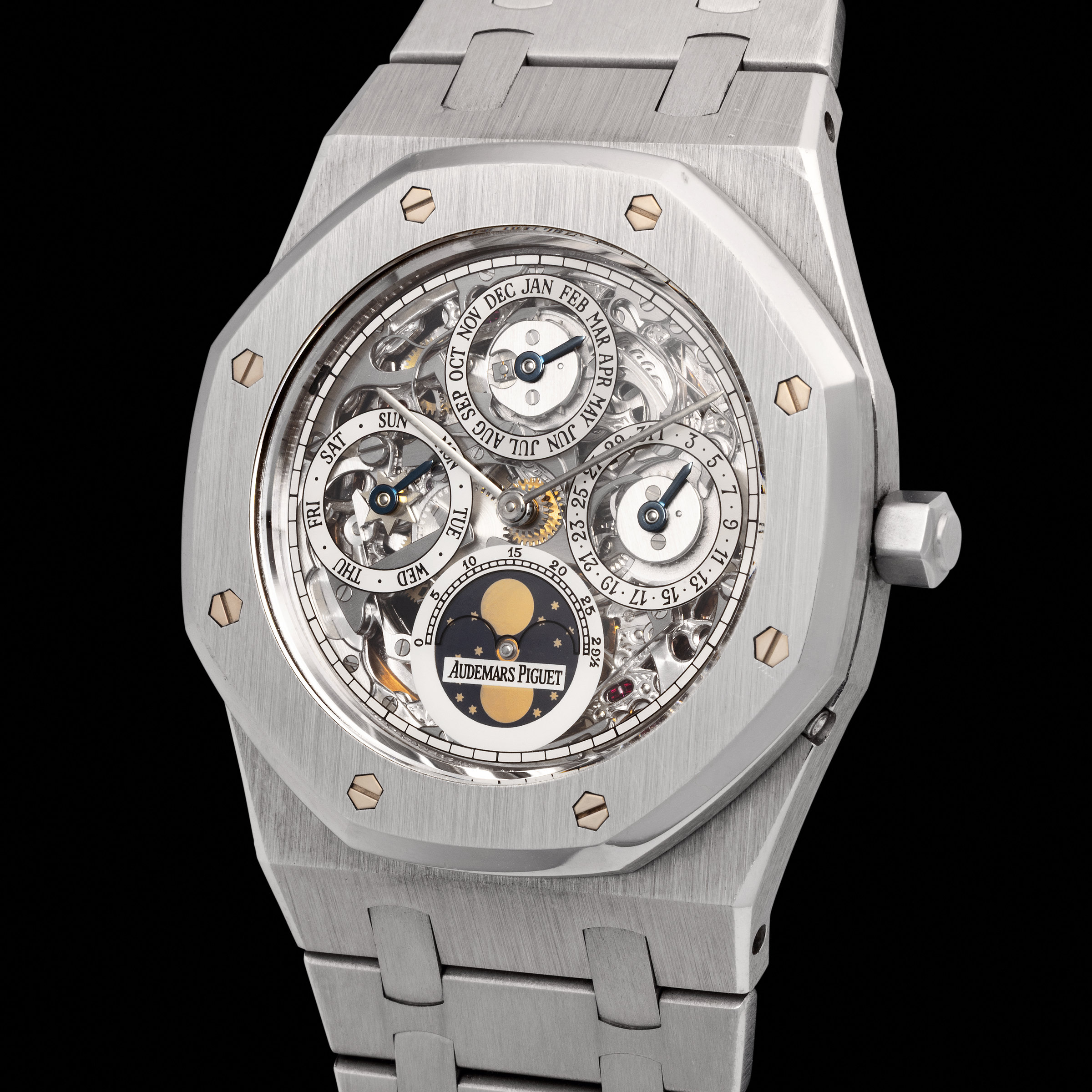 Unveiled in 1986, just two years after Audemars Piguet introduced the first Royal Oak Perpetual Calendar, the reference 25636 was a technical and aesthetic revolution: the world’s first skeletonized perpetual calendar wristwatch with a sapphire caseback. Produced in just 312 pieces across all metals, only 34 examples were crafted in platinum.