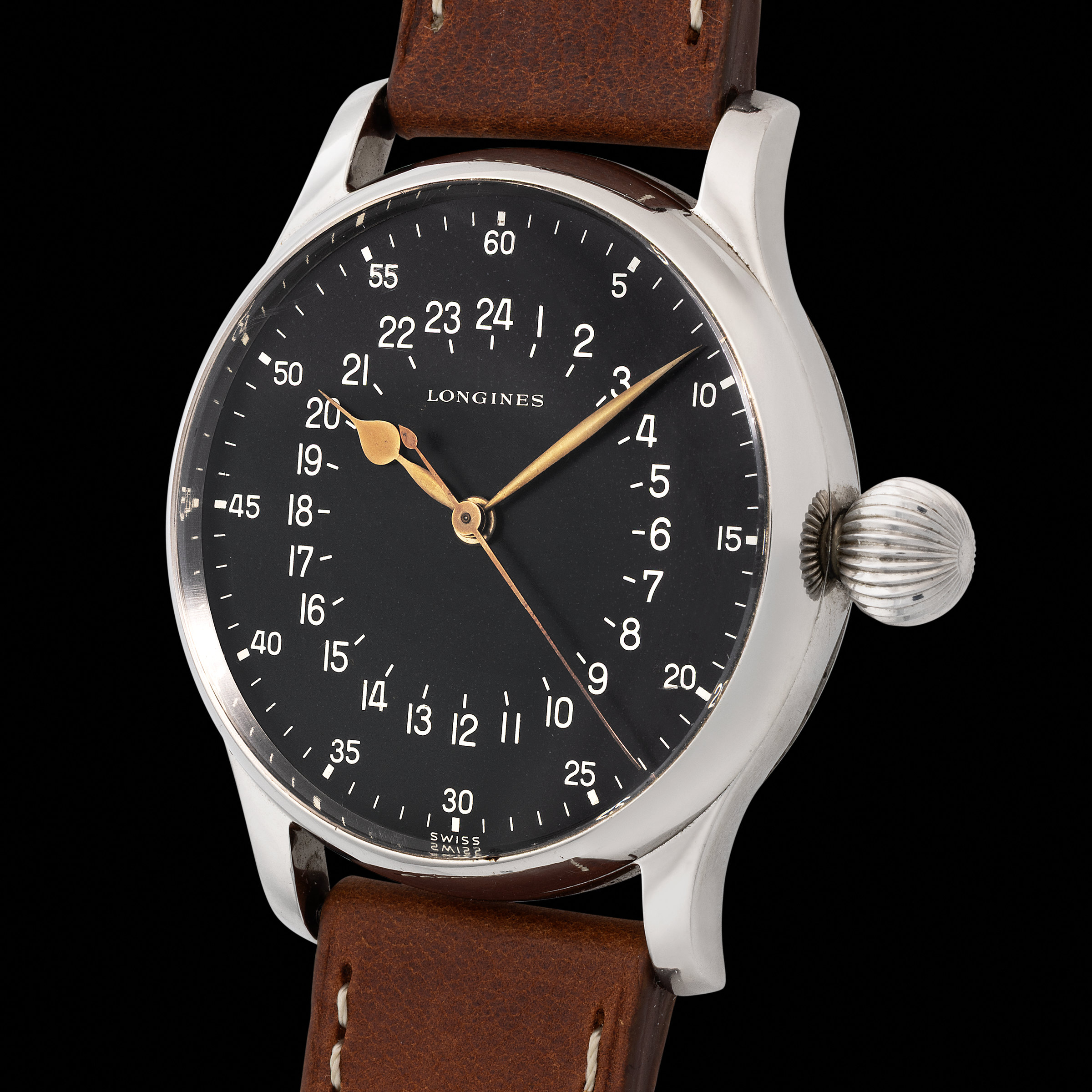 In the golden age of aviation—the 1950s, when commercial flight was rapidly transforming from a luxury into a global norm—a handful of manufacturers rose to meet the technical demands of this new frontier. Among them stood Longines, chosen by Swissair to develop a purpose-built tool watch for its flight crews. Not merely a commercial reference later adopted by professionals, this was a watch born from a direct commission. With a robust, oversized steel case, an easily gripped onion crown, and a stark 24-hour dial for precise legibility at high altitude and low light, the result was an object of pure functional poetry. Confirmed by the Longines Extract as having been delivered directly to Swissair—not through a retailer—this timepiece is part of a rare and elite series tailored exclusively for the airline’s cockpit crews. The engraved caseback, proudly bearing the issue number “75,” adds yet another layer of authenticity to its professional pedigree. Remarkably well-preserved, the present example stuns with its untouched integrity—its engraved caseback remains crisp and deeply defined, while the dial reveals only the faintest whispers of age, a testament to decades of careful stewardship. This charming and exceedingly rare exhudes a palpable sense of history, transporting us to an era when form and function danced effortlessly at 30,000 feet.