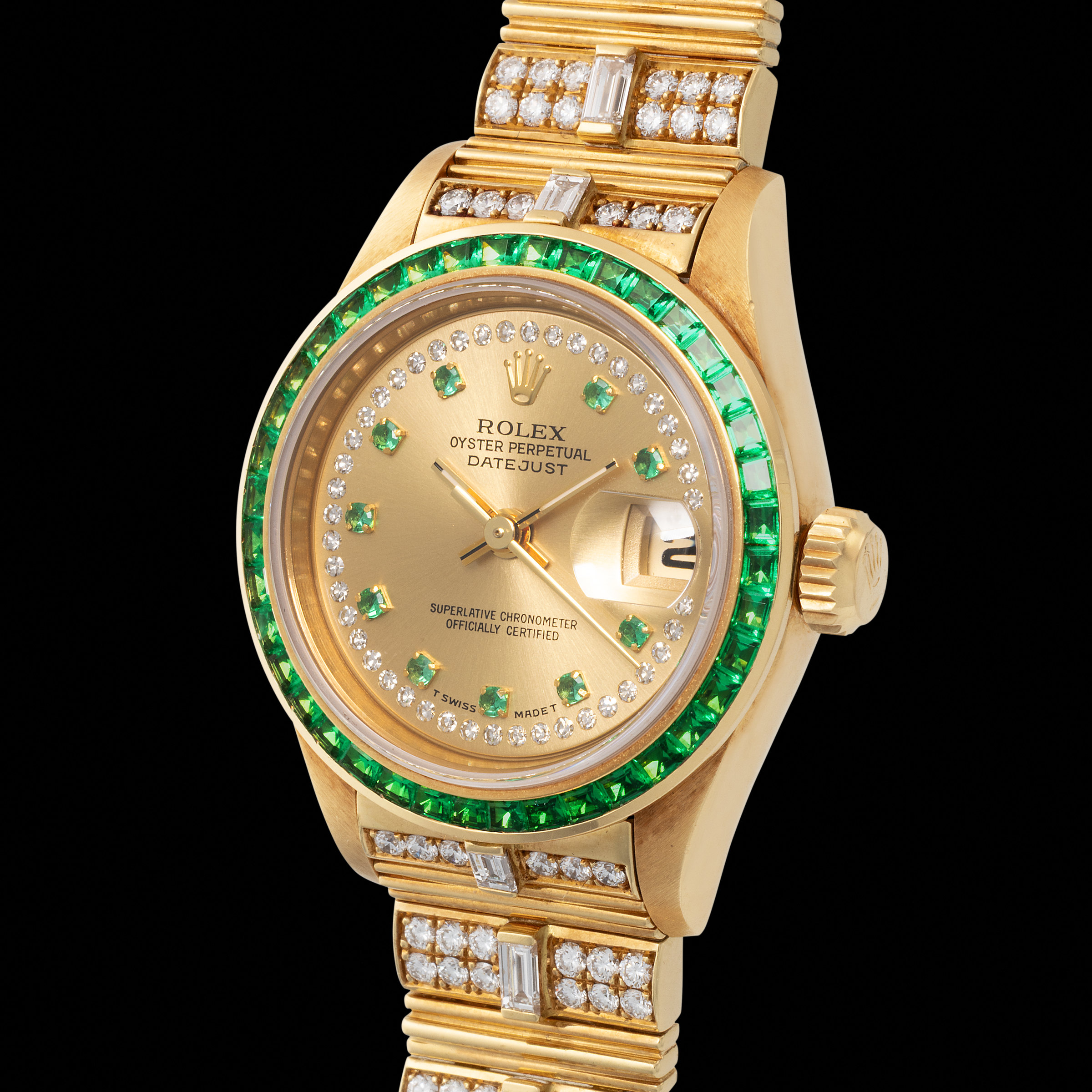 146 Rolex A possibly unique, precious and lavish, Datejust, automatic wristwatch in yellow gold, with emerald-set bezel, diamond and emerald-set dial, brilliant and baguette diamond-set bracelet, with Rolex guarantee, reference 69108.