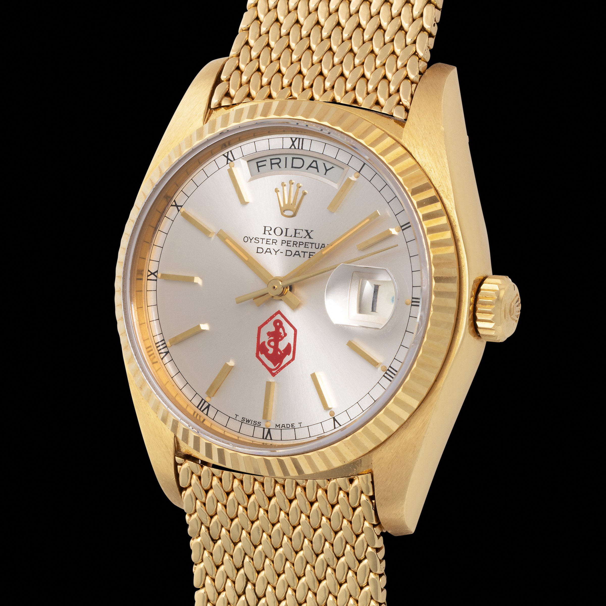 149 Rolex A very attractive, rare and fine, Day-Date automatic wristwatch in yellow gold, with champagne dial, mesh rolex bracelet, guarantee and presentation box, commissioned for the United States Merchant Marines, reference 18038.