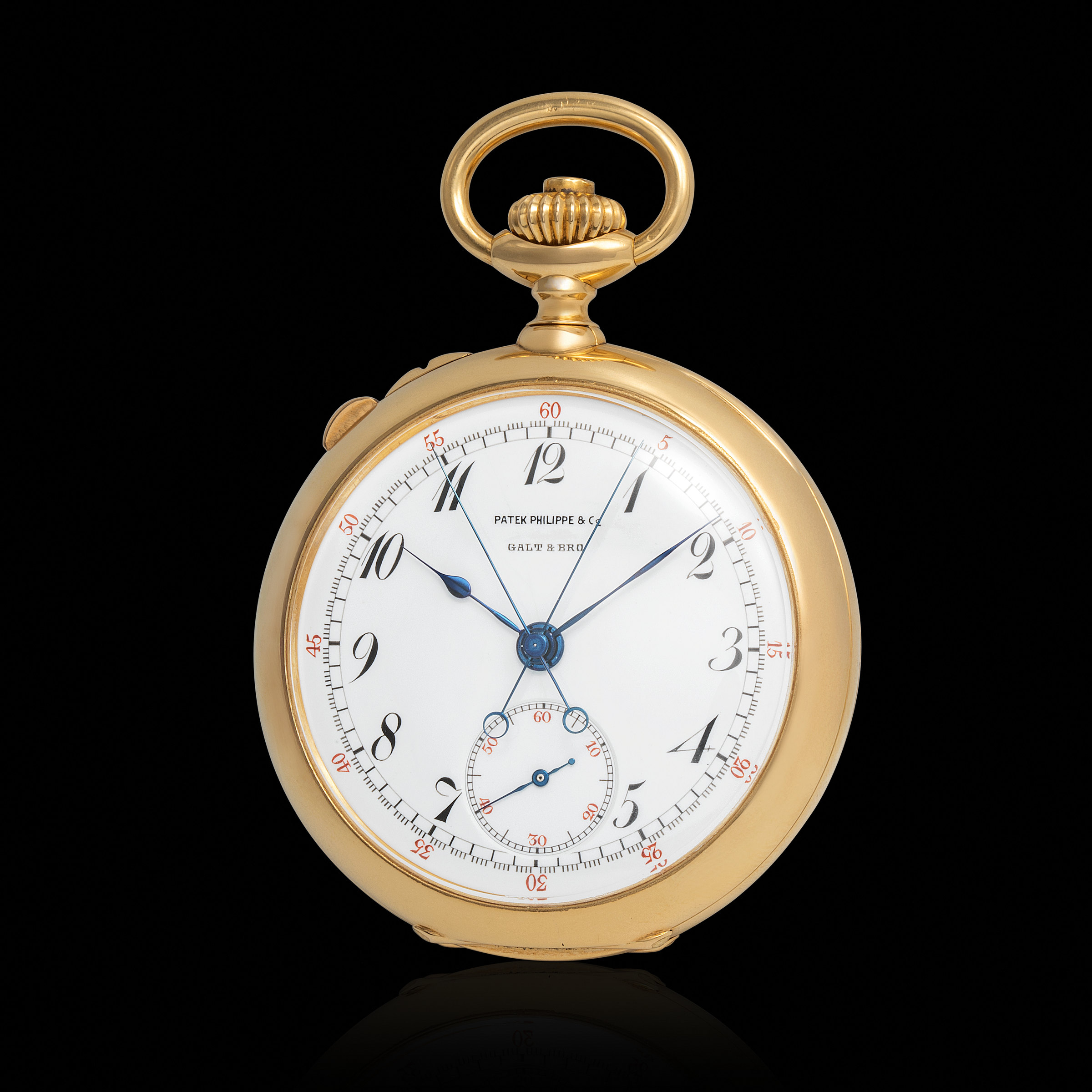 The present example, dating to circa 1900, is a splendid yellow gold open-face split-seconds chronograph pocket watch, displaying both mechanical virtuosity and aesthetic restraint. Its enamel dial, in exceptional condition, is adorned with Breguet numerals, elegant blued steel hands, and a rare and highly prized double signature, bearing both Patek Philippe and Galt & Bro, the venerable American retailer from Washington known for serving the elite clientele of the U.S. capital. Behind the hinged case back, a gorgeously finished movement reveals its complexity with the beautifully executed rattrapante mechanism, a signature of Geneva’s finest ateliers. With crisp engraving, pristine dial condition, and the timeless elegance that defines the golden age of Patek Philippe pocket watches, this piece is not only a technical tour de force, but also a rare object of cultural and historical significance, a window into the horological tastes of early 20th-century Washingtonian society.