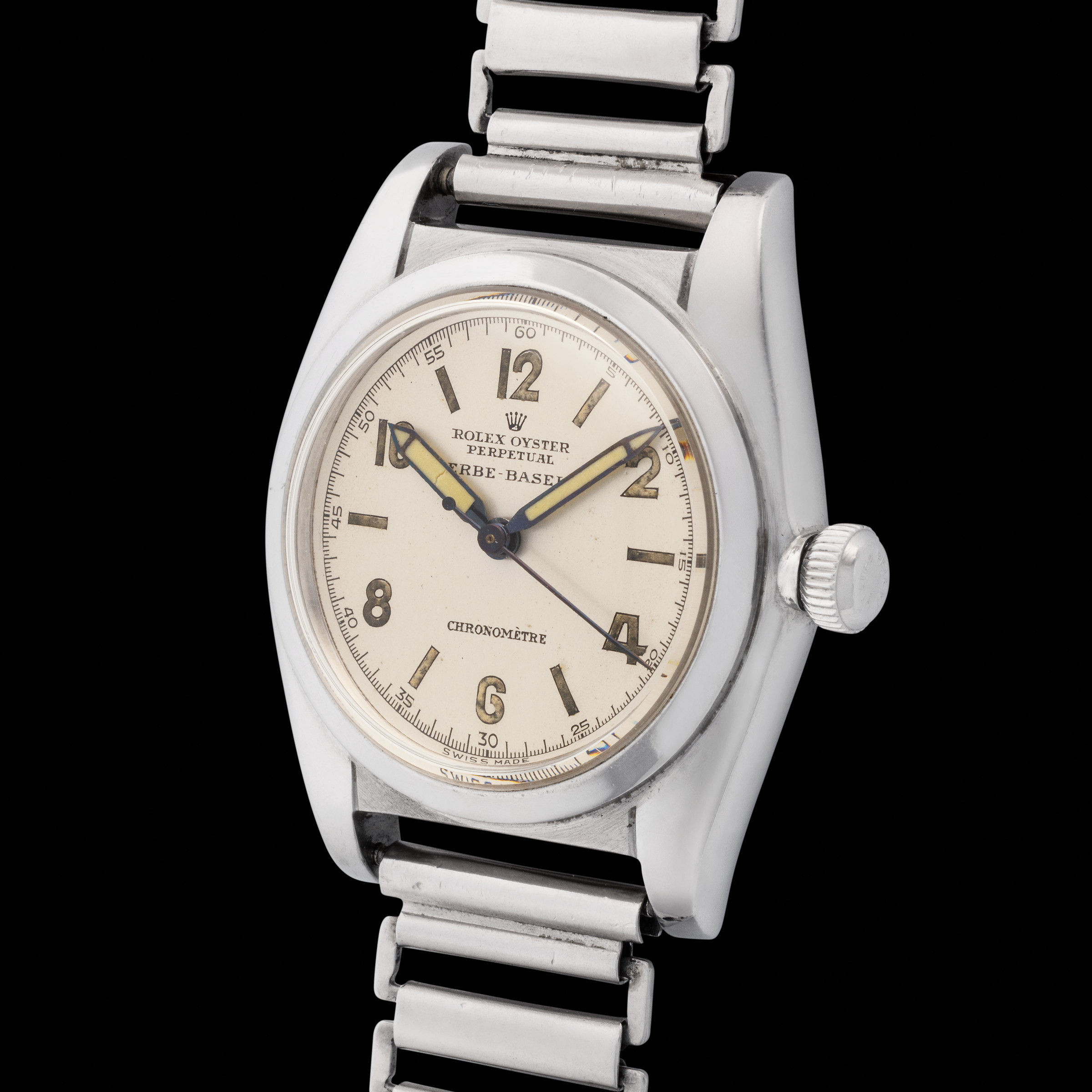 The present Rolex Oyster Perpetual reference 2764 is a superb and extremely rare example of the legendary “Bubbleback” — arguably one of the most important model in Rolex’s early evolution as a manufacturer of waterproof automatic wristwatches. Produced between the early 1930s and mid-1950s, these watches earned their enduring nickname from the rounded caseback, designed to accommodate the rotor mechanism of Rolex’s pioneering self-winding movement.