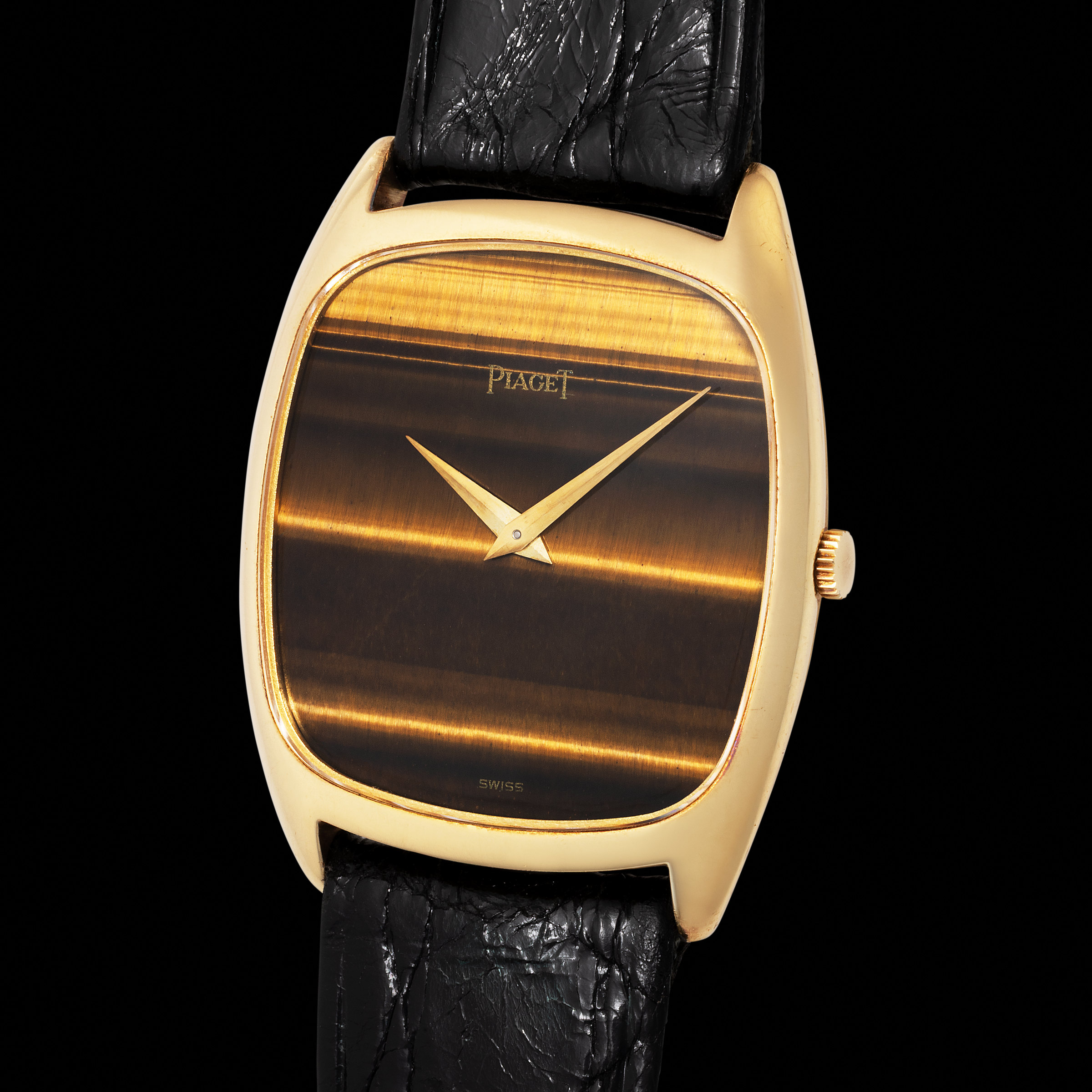 In the 1970s, Piaget carved out a distinctive niche in haute horlogerie by blending watchmaking artistry with ornamental craftsmanship, becoming a pioneer in the use of hard stone dials. This refined example, housed in a slim yellow gold tonneau-shaped case, is a testament to that elegant era. Preserved in excellent condition with deep, crisp engravings on the caseback, the watch exudes understated luxury. The dial, fashioned from tiger eye—a semi-precious stone prized for its silky luster and rich chatoyancy—adds a captivating depth and texture. These stone dials, introduced by Piaget in the 1960s and 70s, were not only a display of technical mastery due to the fragility of the materials, but also an embodiment of individuality, as each stone pattern is entirely unique. Watches like this remain highly sought after by passionates for their rarity, charm, and the maison’s forward-thinking vision of time as wearable art.