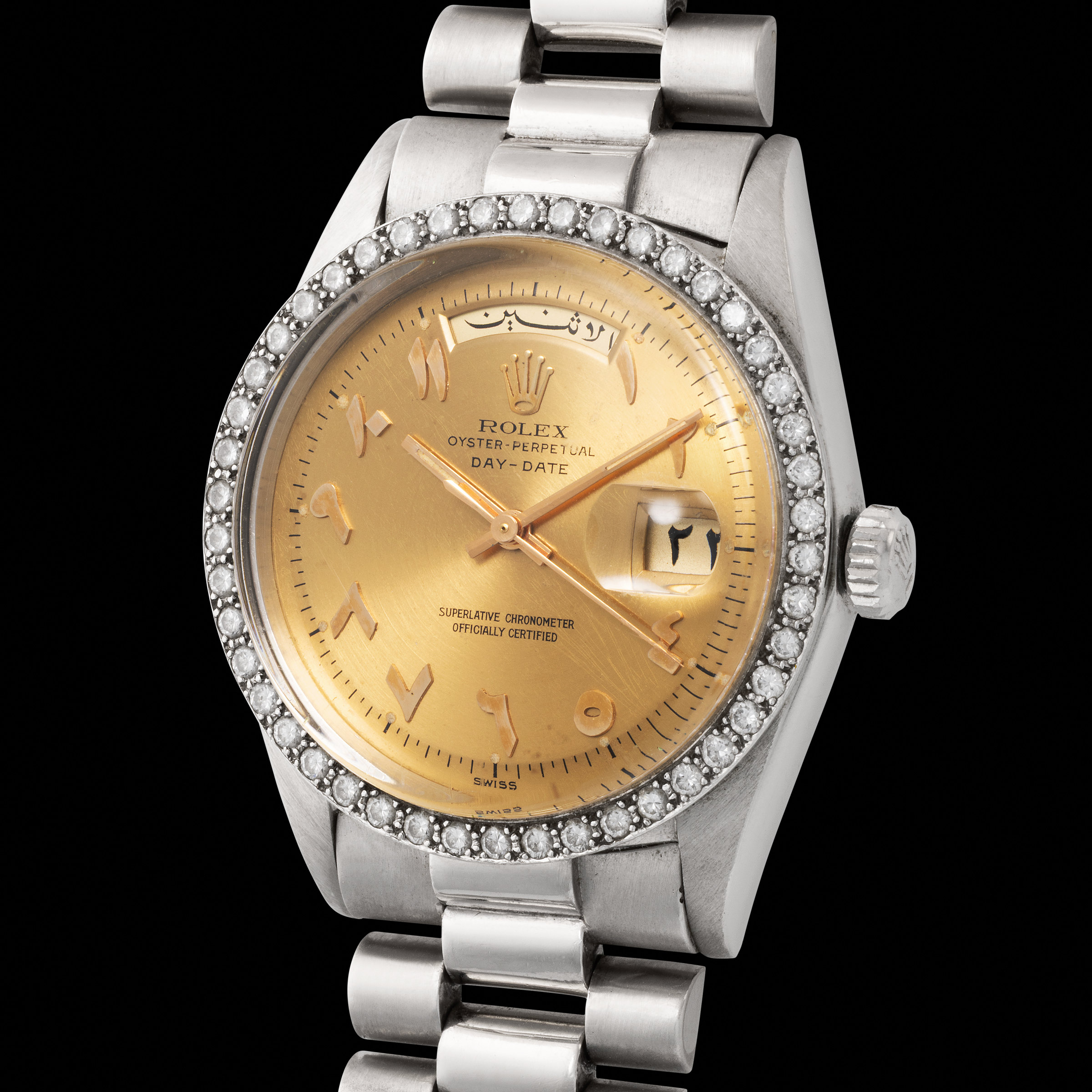 The present watch is not merely a reference 1804 — a model already exalted by its platinum case and factory-set diamond bezel — but one of the very finest examples ever to have surfaced publicly. Manufactured in 1968, it features a full Eastern Arabic calendar, with mesmerizing pink gold applied Eastern Arabic numerals set against a breathtaking gold-tone color dial. The case, fashioned entirely in platinum and adorned with a diamond-set bezel of 46 brilliant-cut stones, is paired with a heavy President bracelet, also in platinum, a configuration reserved for Rolex’s most elite clientele.