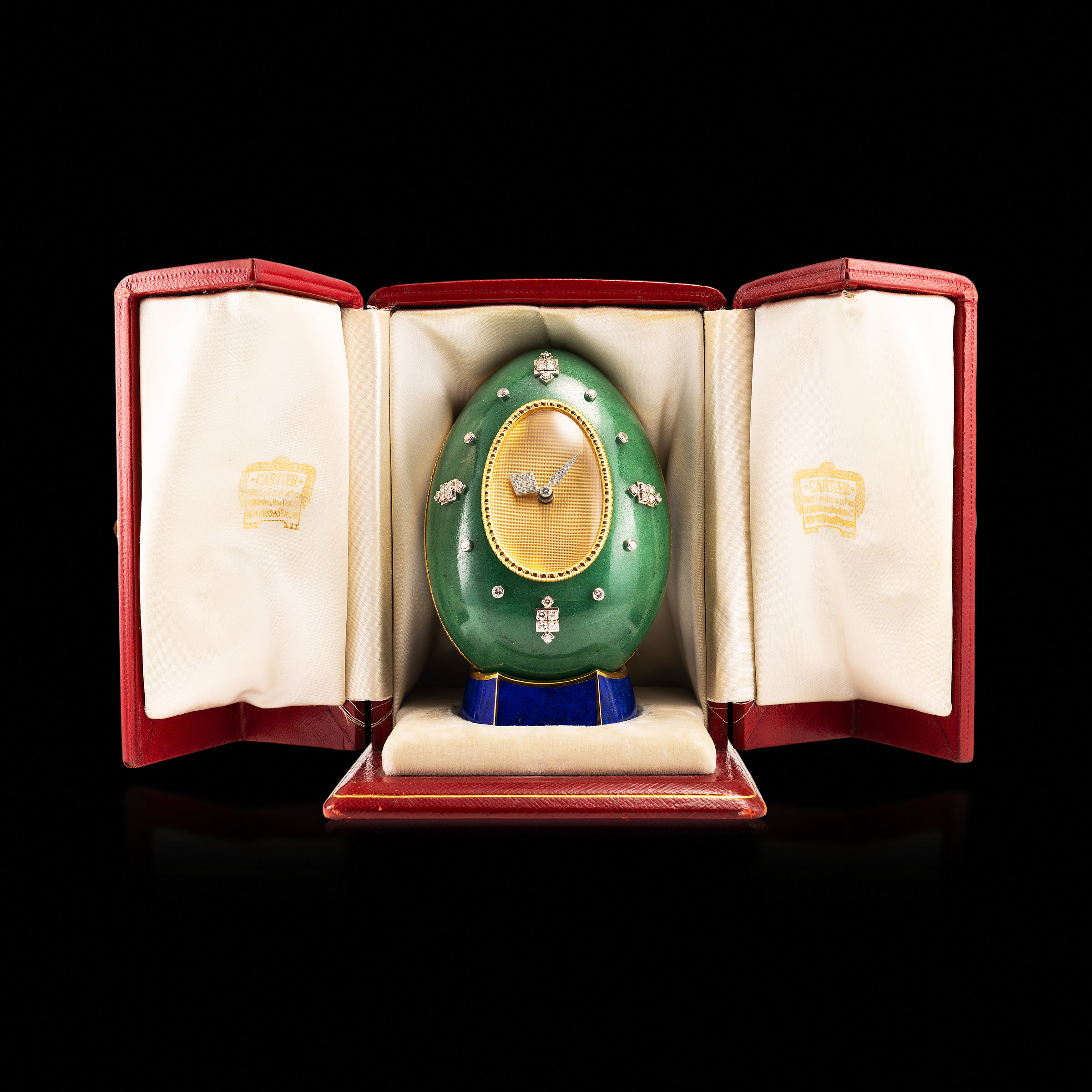 The present clock is one such treasure — a resplendent Cartier Fabergé-style clock of remarkable rarity, emotional resonance, and collector’s allure. The "case" is carved from polished green jasper, shaped into an egg — the most iconic and evocative of Fabergé's motifs — and stands proudly on a deep lapis lazuli pedestal base, each element trimmed in warm yellow gold. The dial itself is an elegant oval cartouche of guilloché gold, its texture subtly shifting in the light, framed by a beaded gold border and surmounted by diamond-set hour markers, each hand-applied in delicate symmetry. The hands — perfectly stylized — are also diamond-set and display a brilliance befitting the high jeweler’s tradition. The surface of the egg is further adorned with diamond-set decorative rosettes and brilliant-cut accents, arranged in harmonious intervals that give the object both architectural balance and ornamental charm. The entire piece carries the sense of joyful theatre: a clock, yes — but also an objet of quiet grandeur and imperial nostalgia.