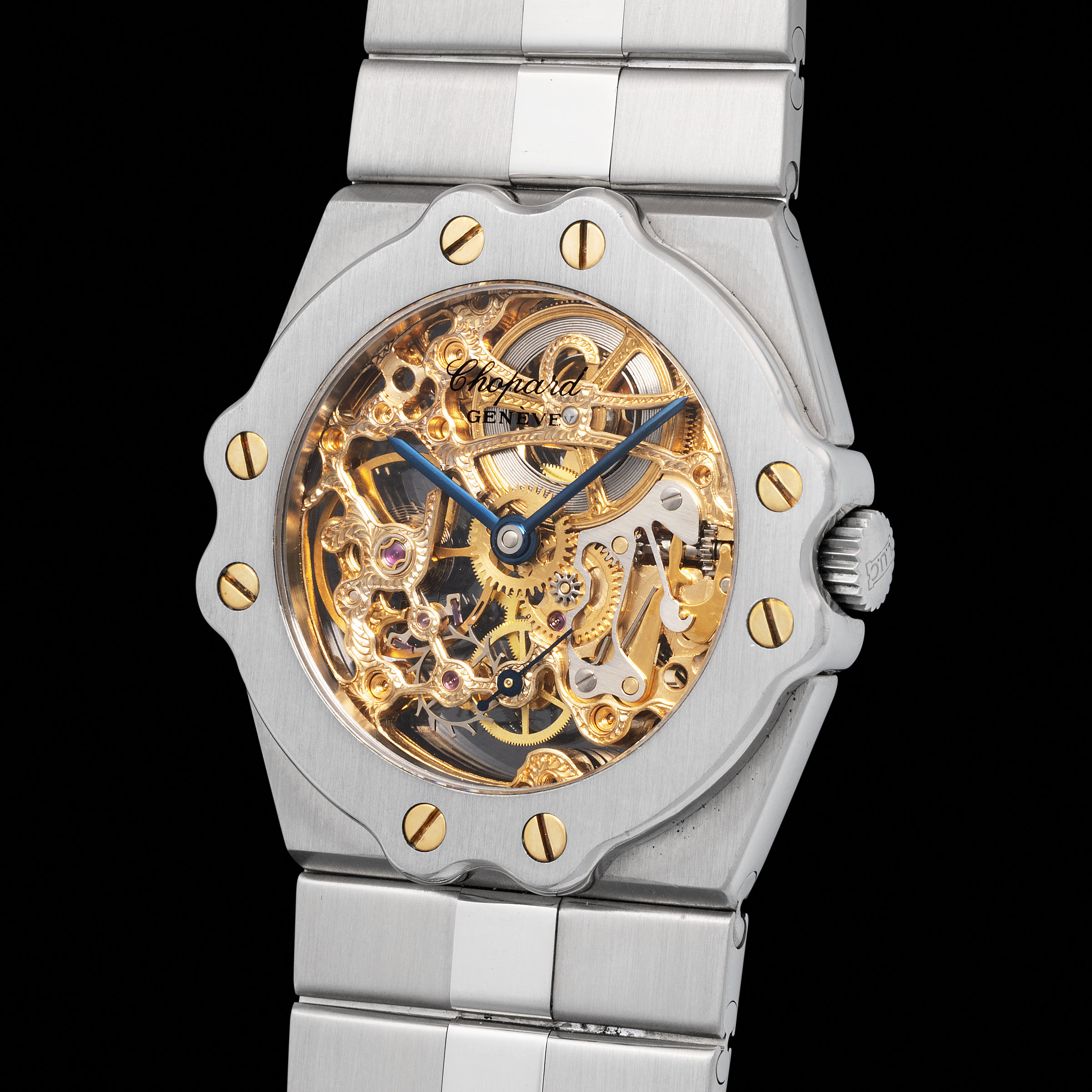 The present example is no ordinary St. Moritz. Beneath its robust stainless steel case—accented by eight exposed screws in yellow gold—lies an extraordinary skeletonized movement, finely hand-finished in gilt and rhodium tones, revealing a dazzling interplay of bridges, gears, and wheels in full mechanical poetry. The transparency of the movement invites the viewer into the very soul of the timepiece, and the bold blued steel hands float with perfect legibility above the intricate landscape. Preserved in excellent condition and fitted to its original integrated bracelet, this rare and charismatic execution of the St. Moritz skeleton ranks among the most coveted expressions of Chopard’s early foray into modern horological design. A deeply sophisticated piece for the collector who appreciates both form and substance.