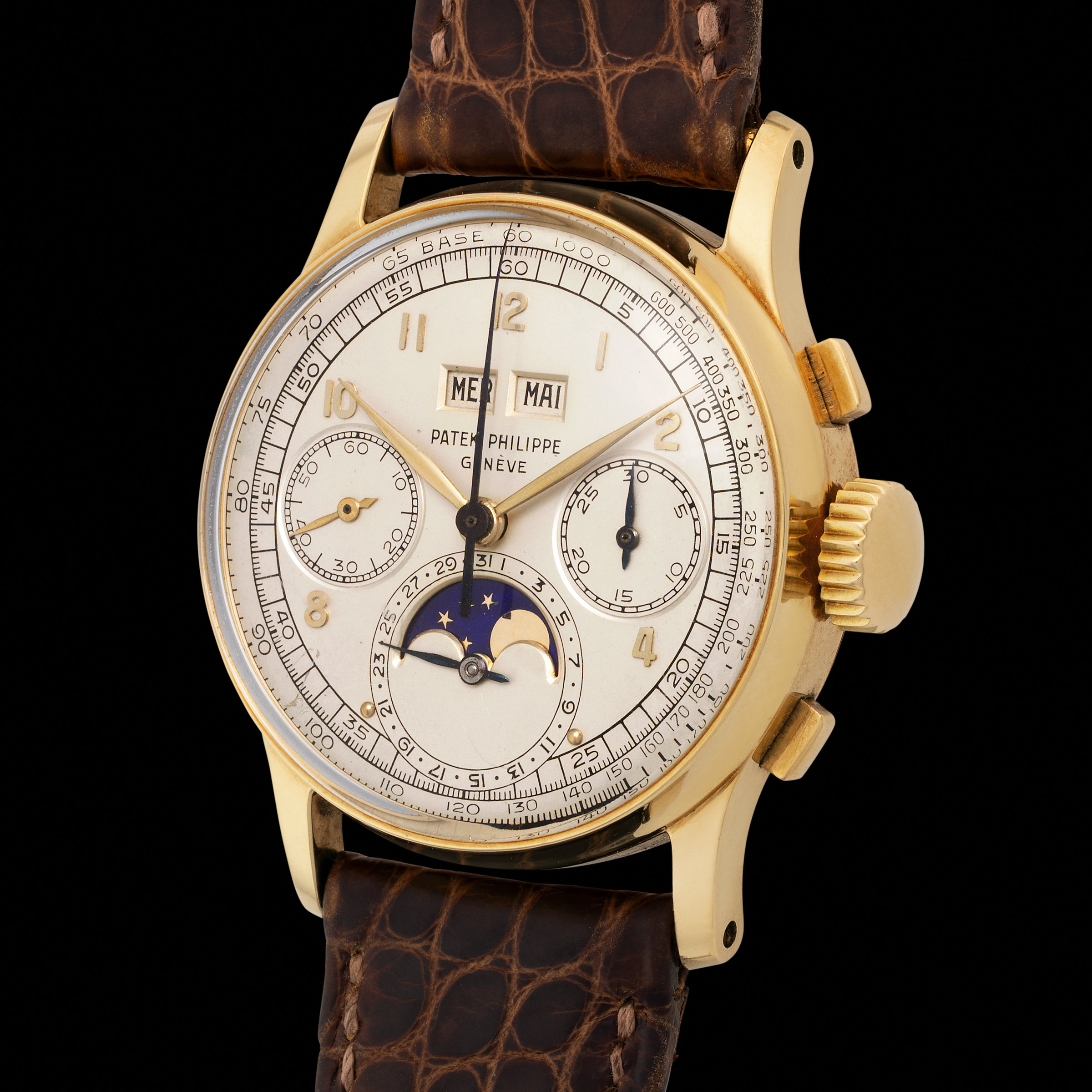 220 Patek Philippe An incredibly rare, sought after, and very collectible, Perpetual calendar, moon phases chronograph wristwatch in yellow gold, with extract from the archives, reference 1518.