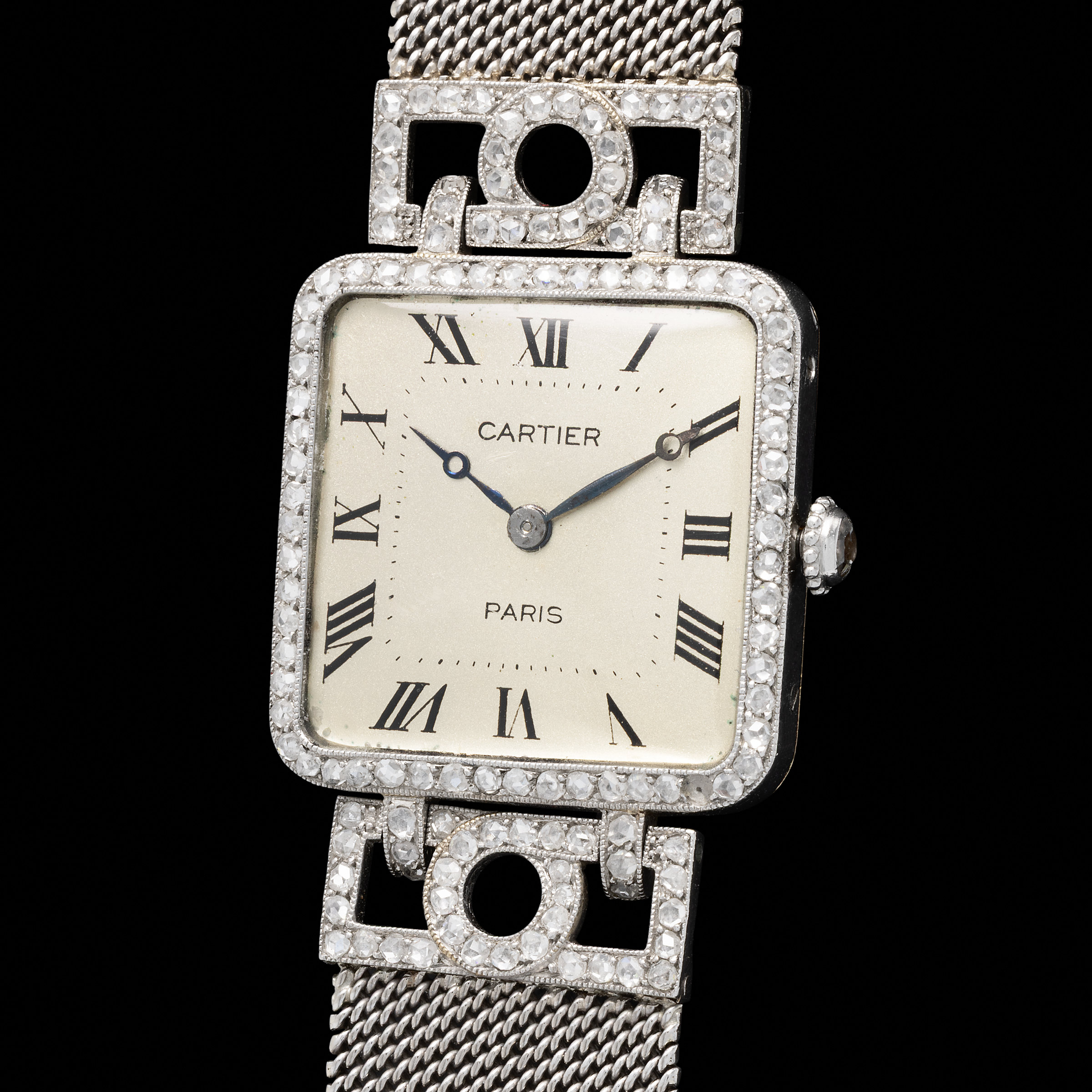 222 Cartier A very elegant and precious, Art Deco, square-shape wristwatch in platinum, with diamond-set bezel and mobile interwined lugs.