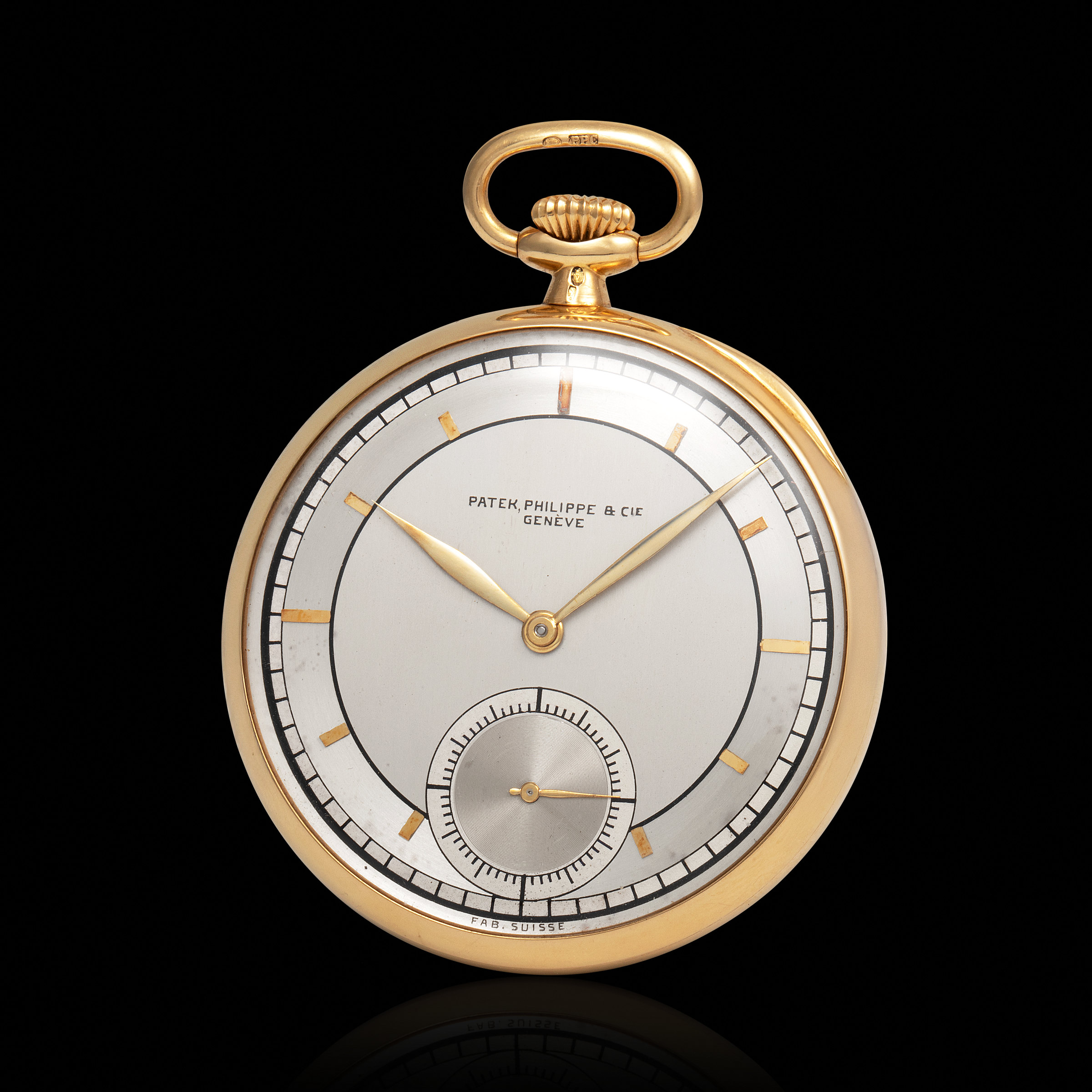 228 Patek Philippe A fine and elegant, open face pocket watch in yellow gold, with two tone dial, box and certificate of origin.
