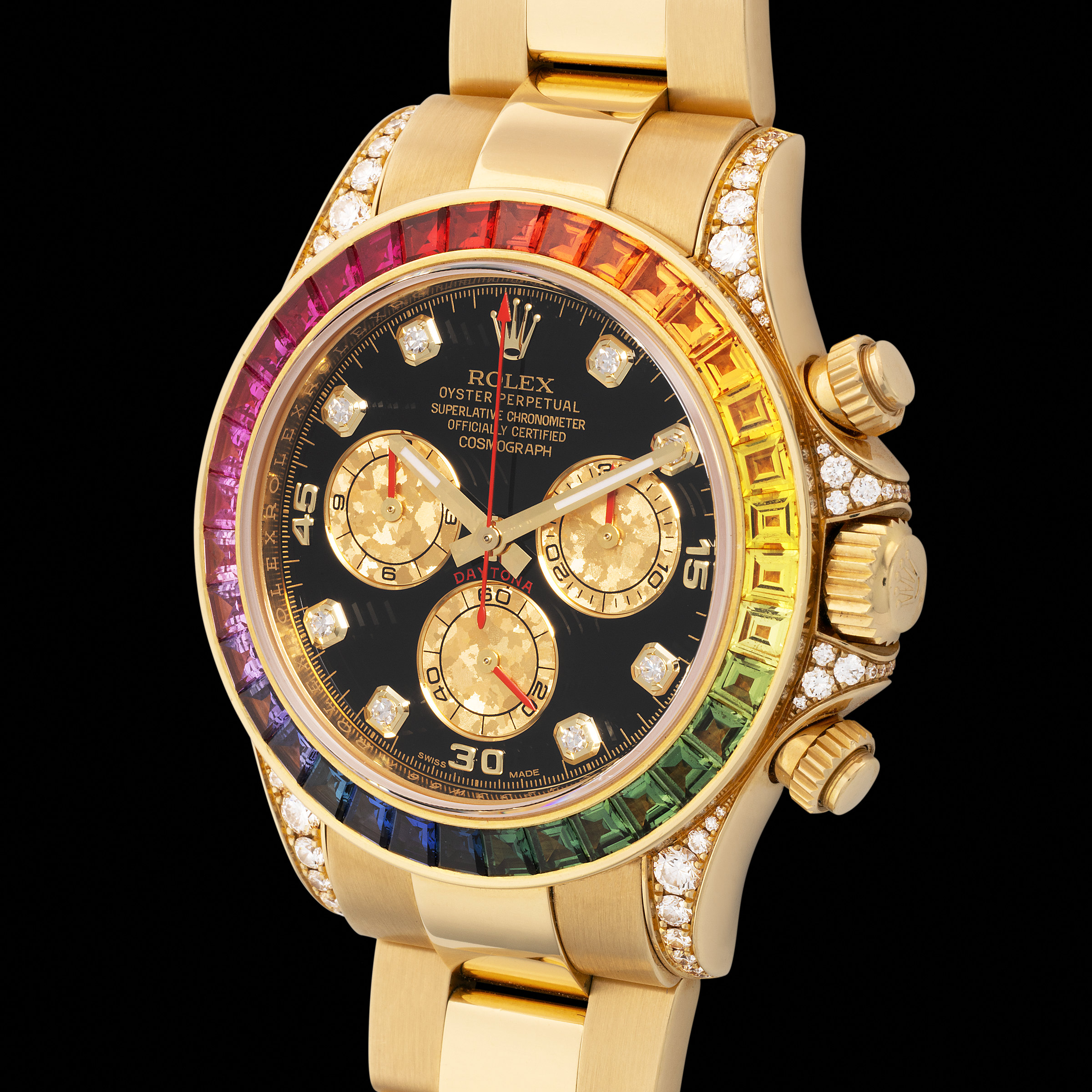 239 Rolex A very fine, attractive and rare Daytona "Rainbow" chronograph wristwatch in yellow gold and diamonds, with rainbow-colored sapphire-set bezel, guarantee and presenation box, reference 116598RBOW.