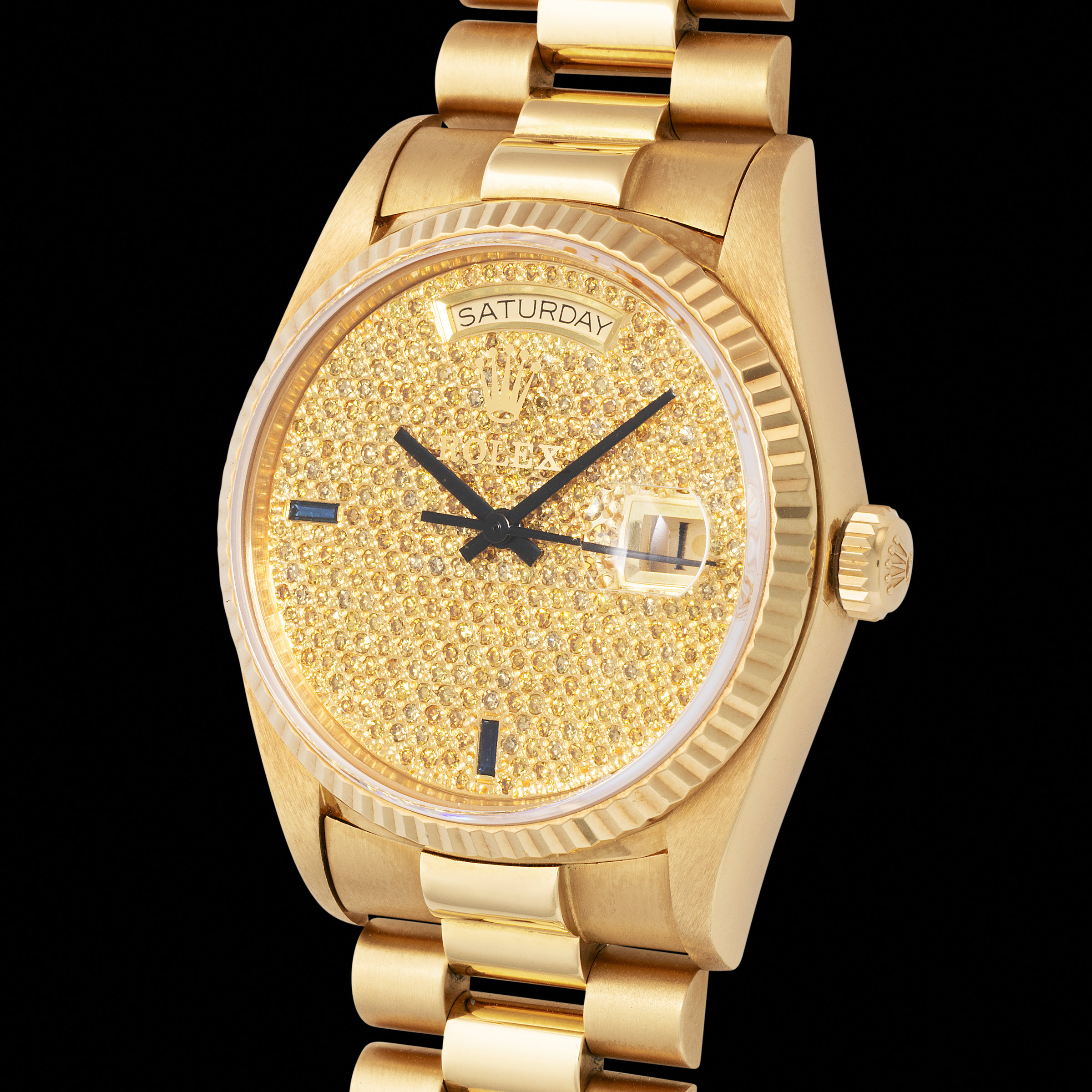 The present example, however, is far more than just a 18038. It is a rare showcase of Rolex’s artistic prowess—crafted in solid 18k yellow gold and fitted with a dial that pushes the limits of luxury: an astonishing field of pavé-set yellow diamonds, one of the rarest and most visually arresting configurations ever fitted to a Day-Date. The richness of the yellow diamonds blends seamlessly with the warmth of the gold case and President bracelet, creating a monochromatic symphony of opulence. The present example is the only yellow diamonds dial we have ever seen, making this watch a true collector’s trophy.
