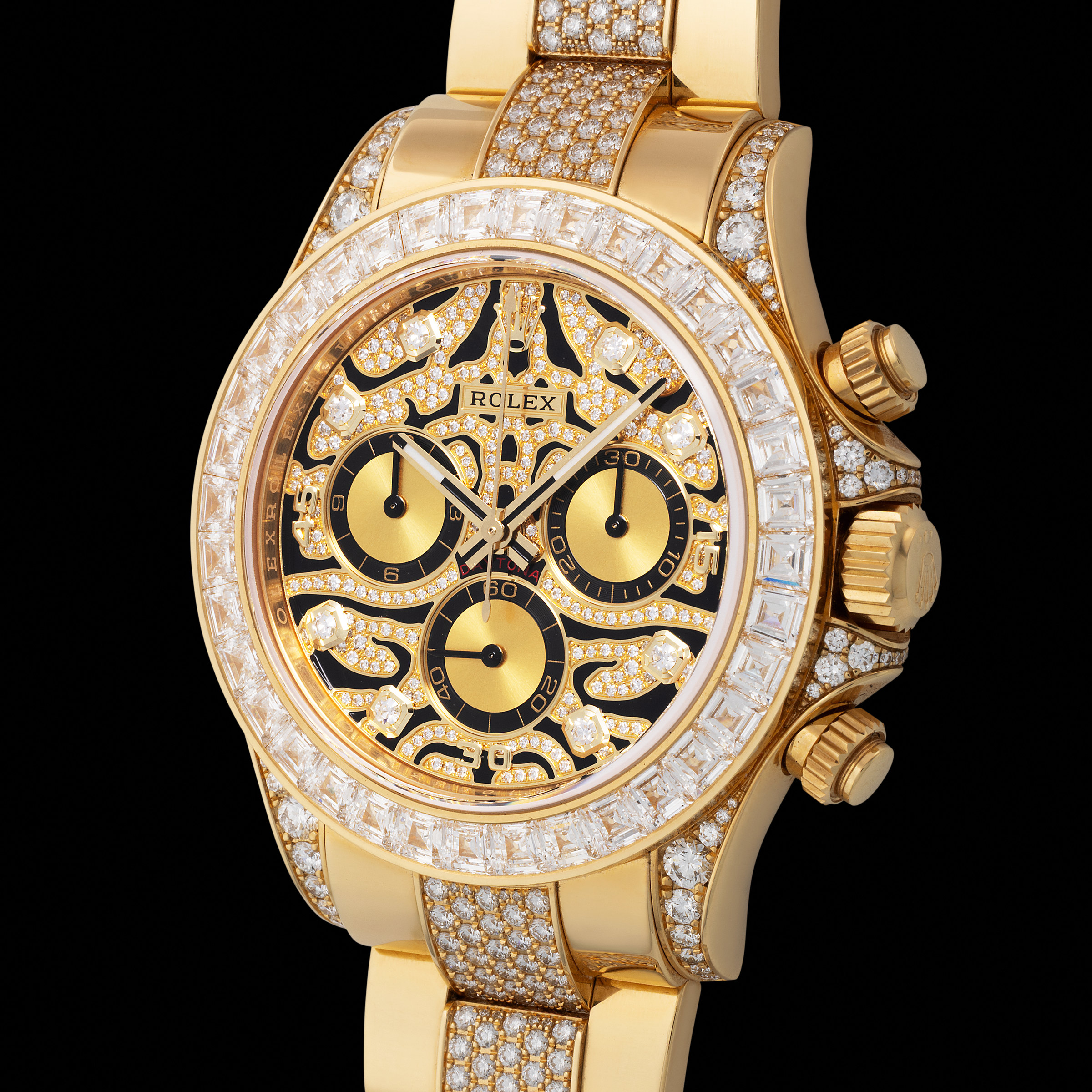 Rolex has long mastered the art of metamorphosis—transcending tool-watch origins to craft creations that are nothing short of haute joaillerie. Nowhere is this alchemy more potent than in the maison’s gem-set sports watches, which occupy a rarefied echelon within the collecting world. And among these, few pieces express that fusion of opulence and performance quite like the Cosmograph Daytona offered here.
