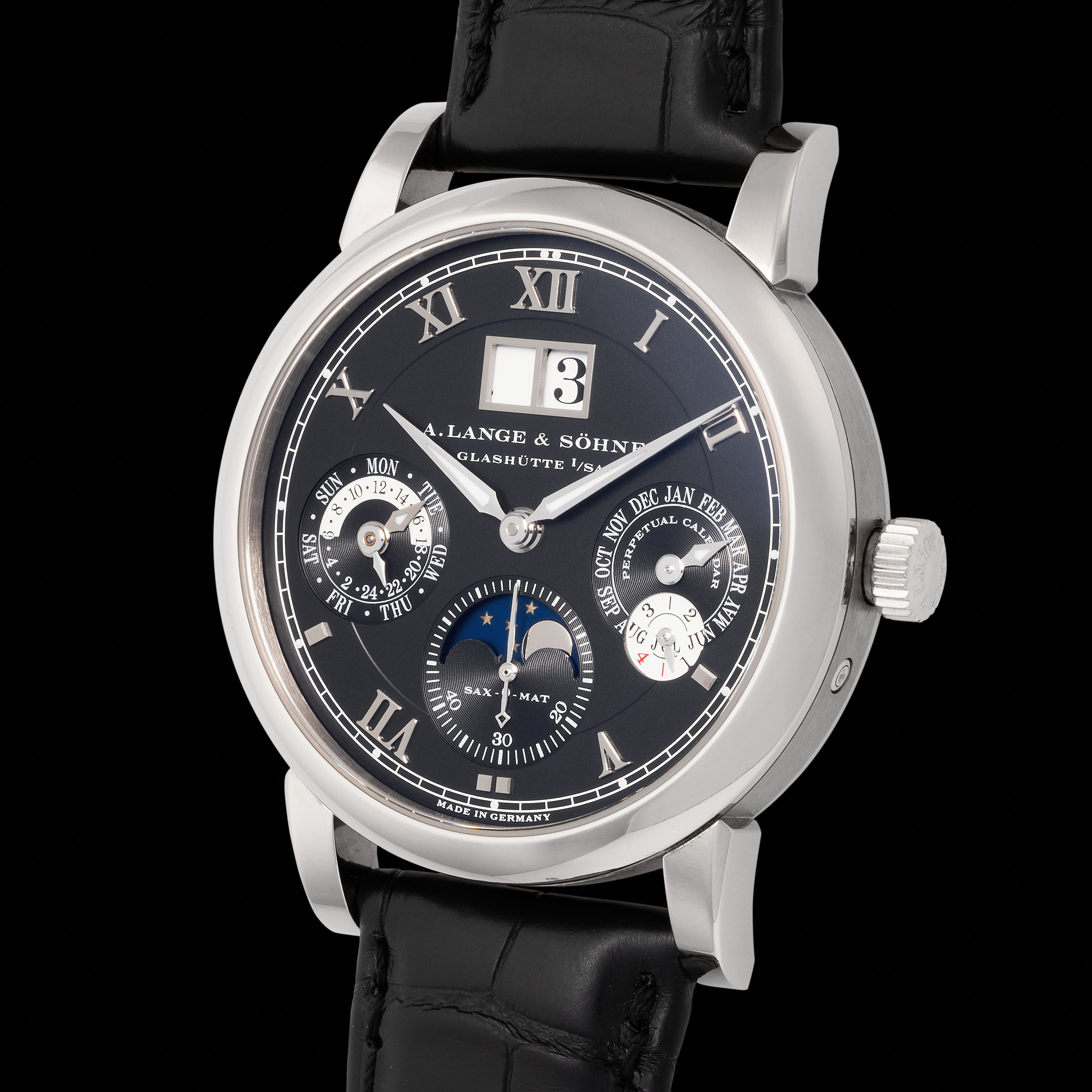 252 A. Lange & Sohne A very fine and attractive, Langematik Perpetual, perpetual calendar, moon phase, date, leap year, automatic wristwatch in white gold, with black dial, guarantee and winding presentation box.