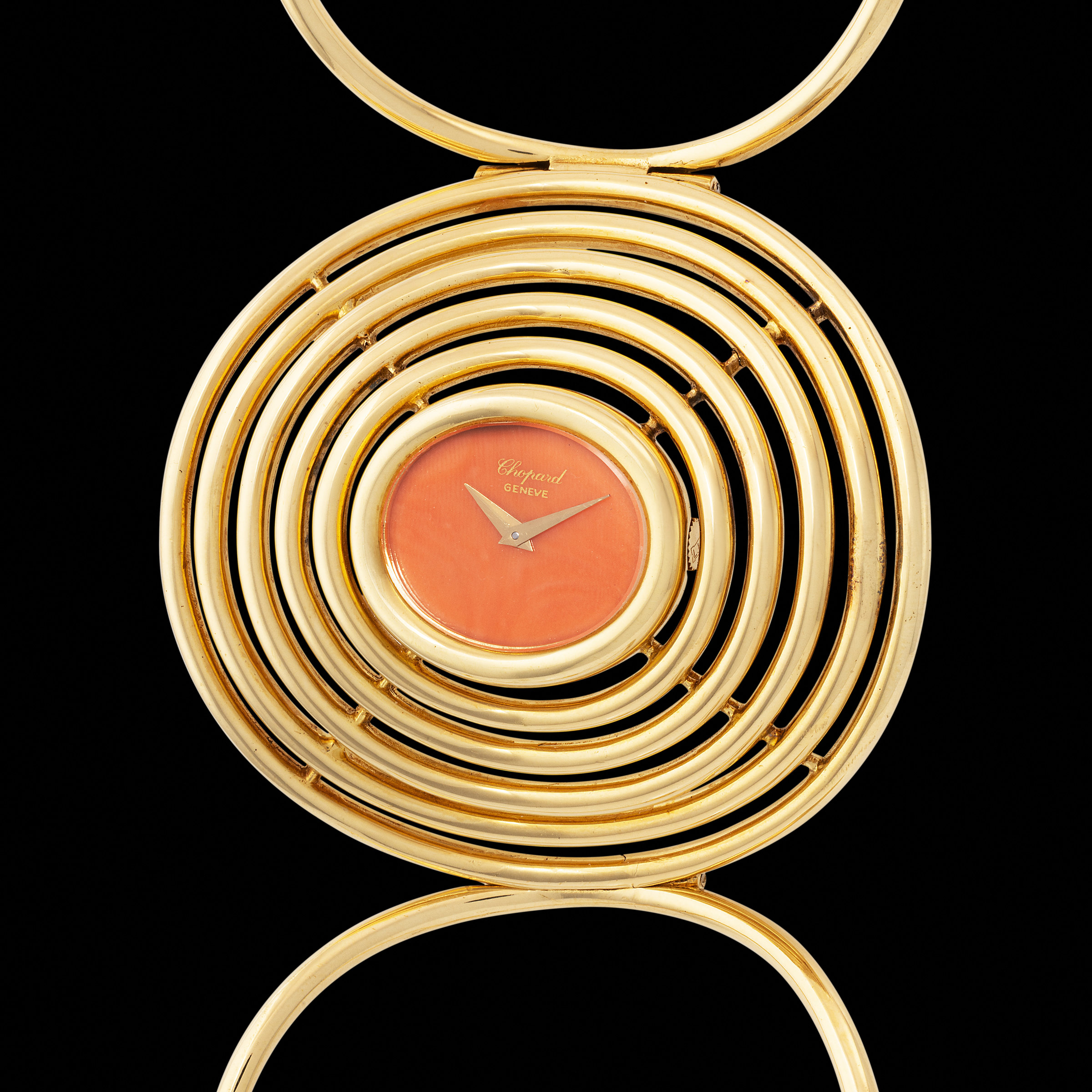 This extraordinary ladies' bracelet watch from the 1970s is a magnificent testament to Chopard's creative audacity during this period. Fashioned from luminous yellow gold, the design is a sculptural marvel, a kinetic expression of form and function. The centerpiece of the bracelet is a stunning arrangement of concentric golden circles, meticulously crafted and radiating outwards from the petite, oval-shaped dial. The dial itself is a stroke of genius, executed in a warm, vibrant coral hue that provides a striking contrast against the polished gold, while also subtly echoing the organic curves of the surrounding metalwork. The integrated bracelet is equally impressive, featuring large, fluid circular links that continue the theme of geometric harmony and ensure a comfortable, elegant fit on the wrist. This piece is not merely a time-telling instrument; it is a wearable sculpture, a statement of daring style and impeccable taste, a true jewel from a golden age of watchmaking design.