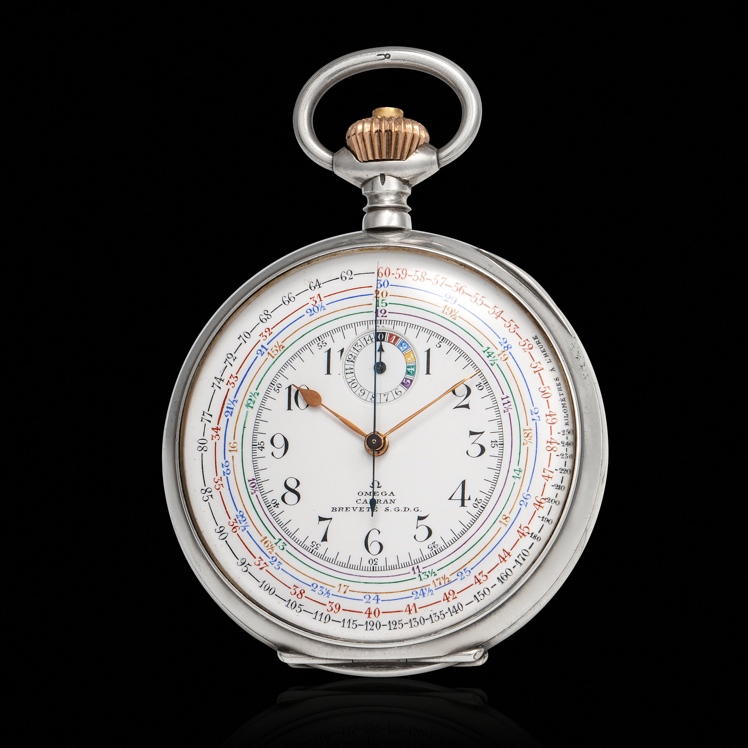 257 Omega A highly attractive and exceptional, chronograph pocket watch in silver, with enamel multi scale and colours dial, with Grand Prix Paris 1900 engraving.