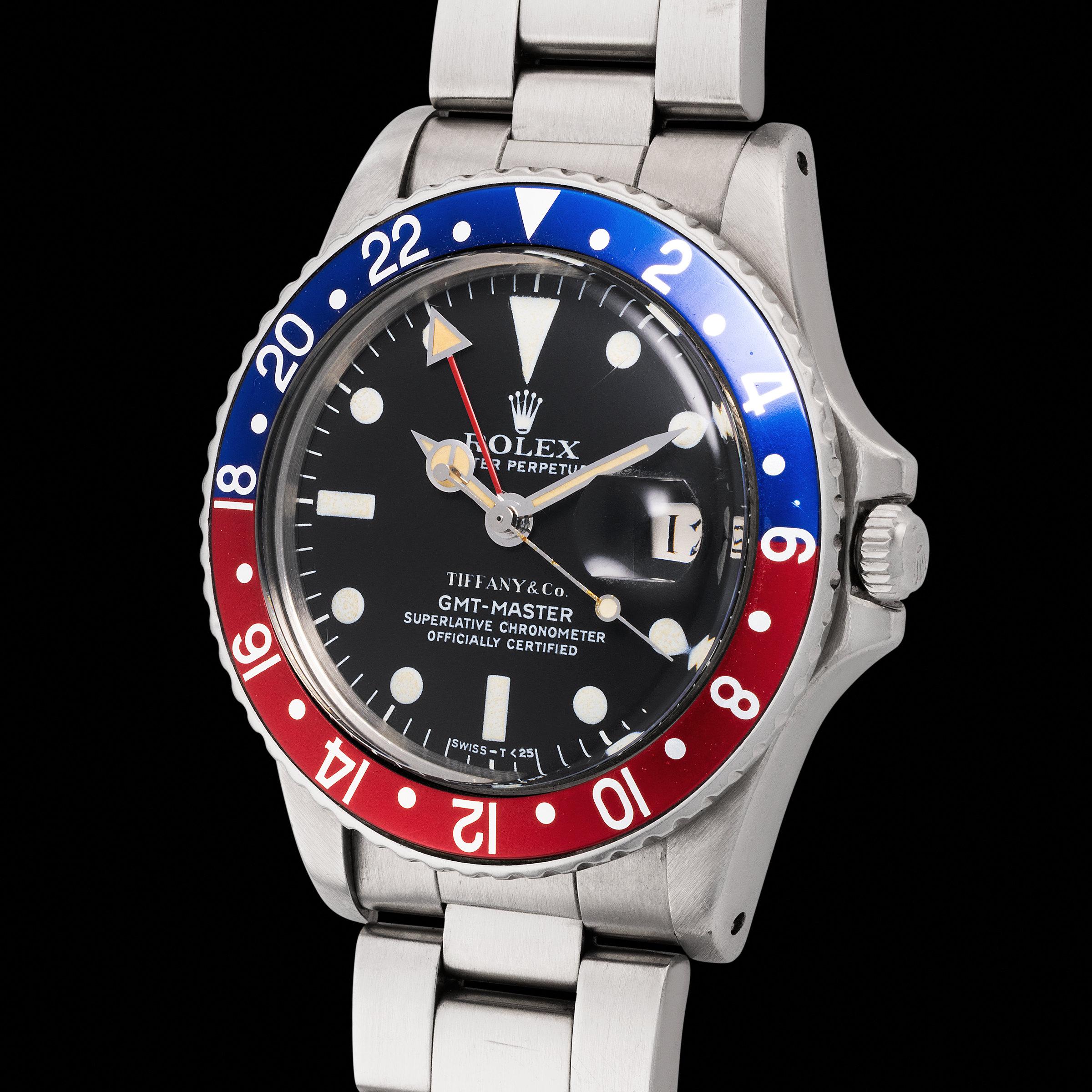 Preserved in attractive condition, with its original red-and-blue “Pepsi” bezel and Oyster bracelet, this watch is a cultural artifact, representing an era of air travel, retail sophistication, and Swiss watchmaking ambition.