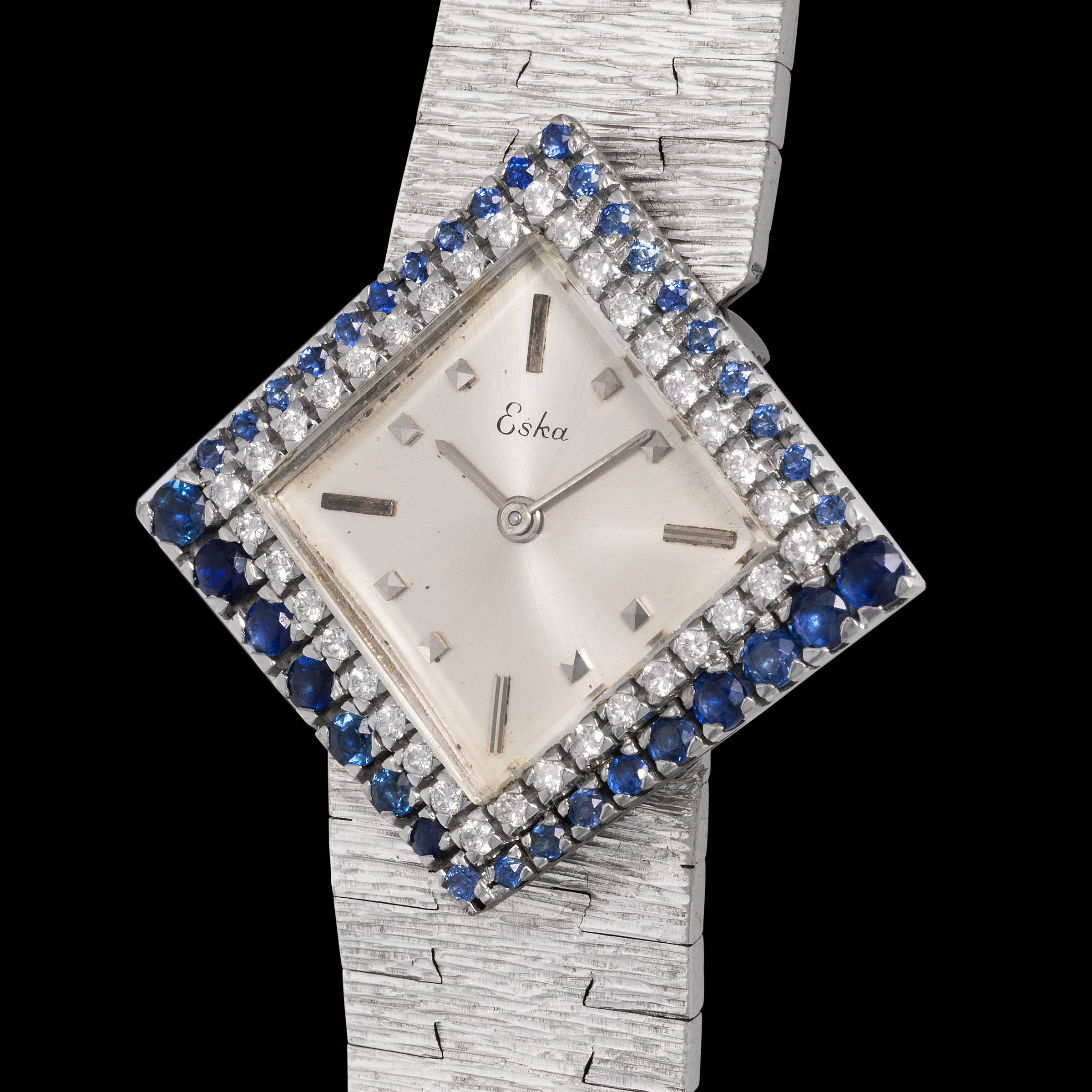 In an era where design knew no boundaries and jewelry watches blurred the line between horology and haute couture, Eska, a lesser-known but spirited Swiss manufacture, produced this captivating timepiece, a testament to the boldness of mid-century creativity. With a unique square case set on the diagonal, this wristwatch immediately commands attention not with flamboyance, but with intent. Framed by alternating rows of brilliant-cut diamonds and vibrant blue sapphires, the case is a study in symmetry and contrast, anchored by a textured white metal bracelet that shimmers like woven silk. It speaks to a time when even everyday elegance was touched by daring experimentation. Yet this watch is not only an accessory; it is a reflection of a cultural moment, a piece of post-war optimism translated into wearable art. Much like the works of Andrew Grima for Omega or Gilbert Albert for Patek Philippe, this piece embraces asymmetry and architectural tension with the precious and symmetrical use of diamonds and sapphires—elements seldom seen outside the world of bespoke design. While the Eska signature may not boast the pedigree of the grandes maisons, this only heightens its charm. It is precisely the type of timepiece that, when offered at auction, invites a second look—first out of curiosity, then out of admiration, and finally out of desire. A sleeper gem from a golden age of jeweled creativity.