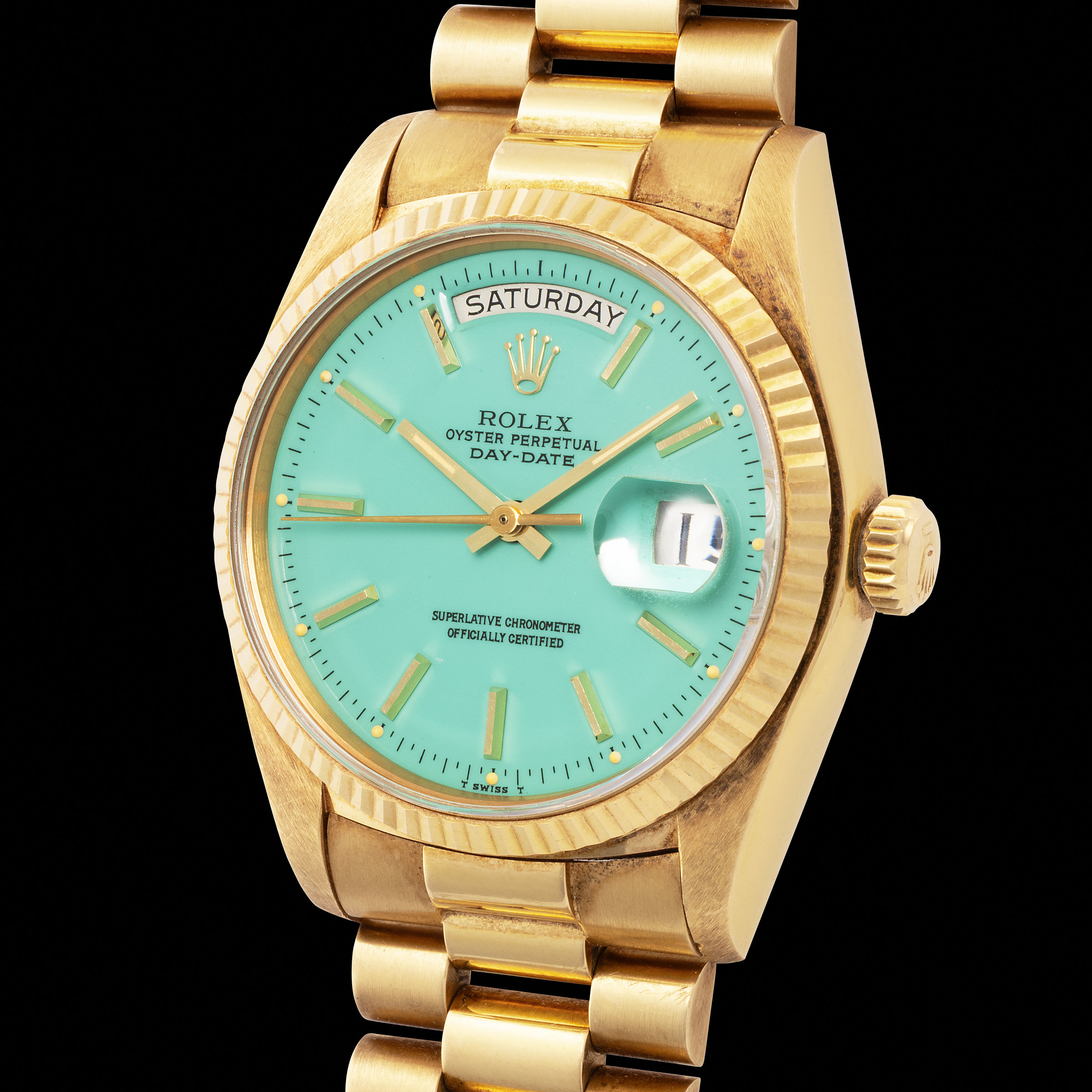 The present Day-Date reference 18038, cased in yellow gold, is graced by one of the most desirable of all Stella tones: a radiant turquoise blue, remarkably close to the hue now ubiquitously known as “Tiffany.” Its glossy lacquer finish is impressive and one of the most appealing we had the chance to see. The watch retains its original case proportions, with sharp fluted bezel and well defined lugs, as well as its matching yellow gold President bracelet.