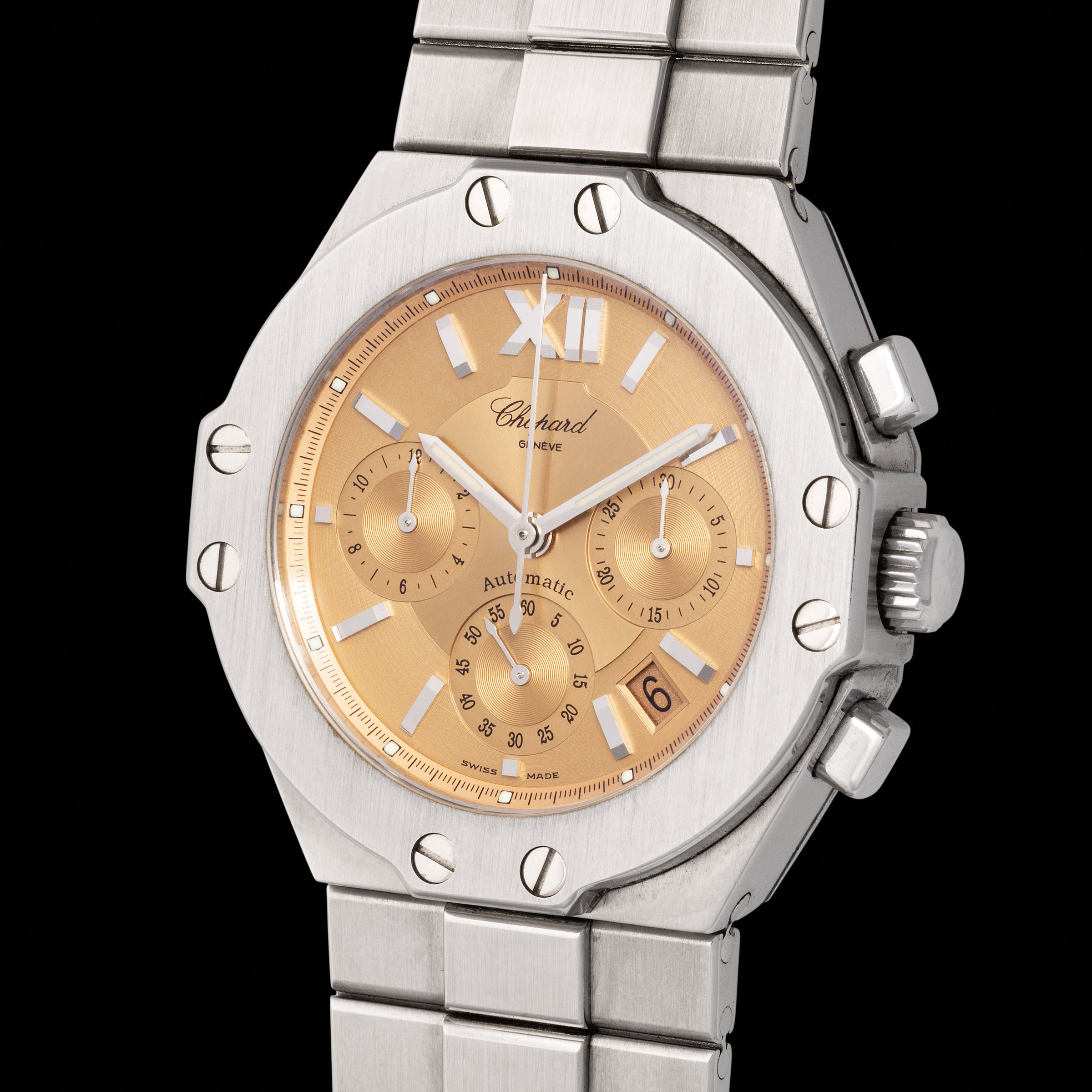 39 Chopard A valuable and elegant, St. Moritz, chronograph automatic wristwatch in steel, with date and pink salmon dial, reference 8333.