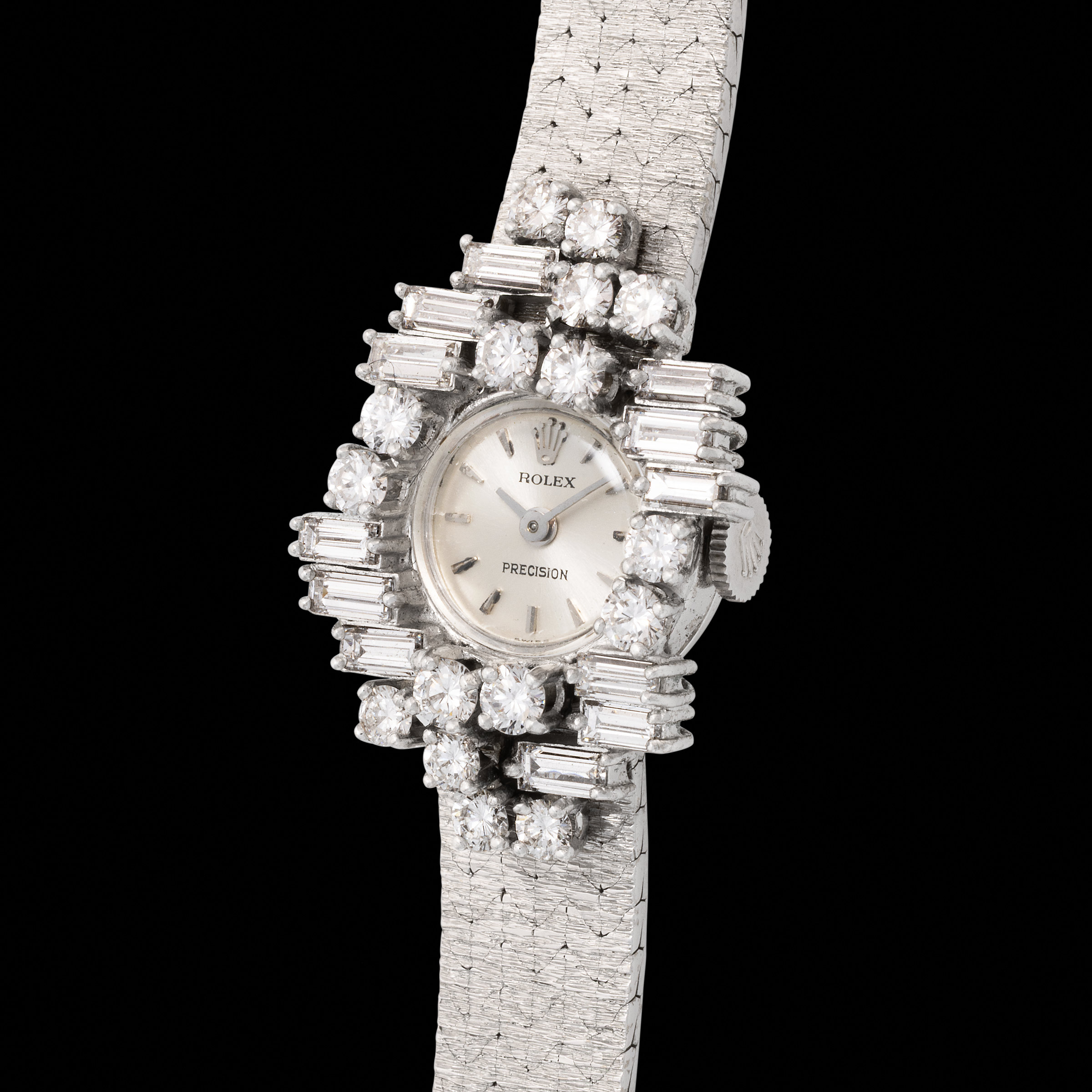 This dazzling Rolex "Precision" is a sublime example of such artistry. Cased in 18K white gold and framed by a dramatic ensemble of brilliant, and baguette-cut diamonds, the watch exudes a sculptural balance and glamour that recalls the golden age of mid-century jewelry design. The "scale-motifed" white gold bracelet, textured like fine silk, complements the brilliance of the stones with a subtle shimmer, while the diminutive silvered dial signed "Precision" retains Rolex’s hallmark commitment to functionality and restraint. Worn as a timepiece or as a jewel, this creation transcends categories, at once a piece of horology and a masterpiece of elegance, it is a celebration of form, rarity, and enduring beauty.