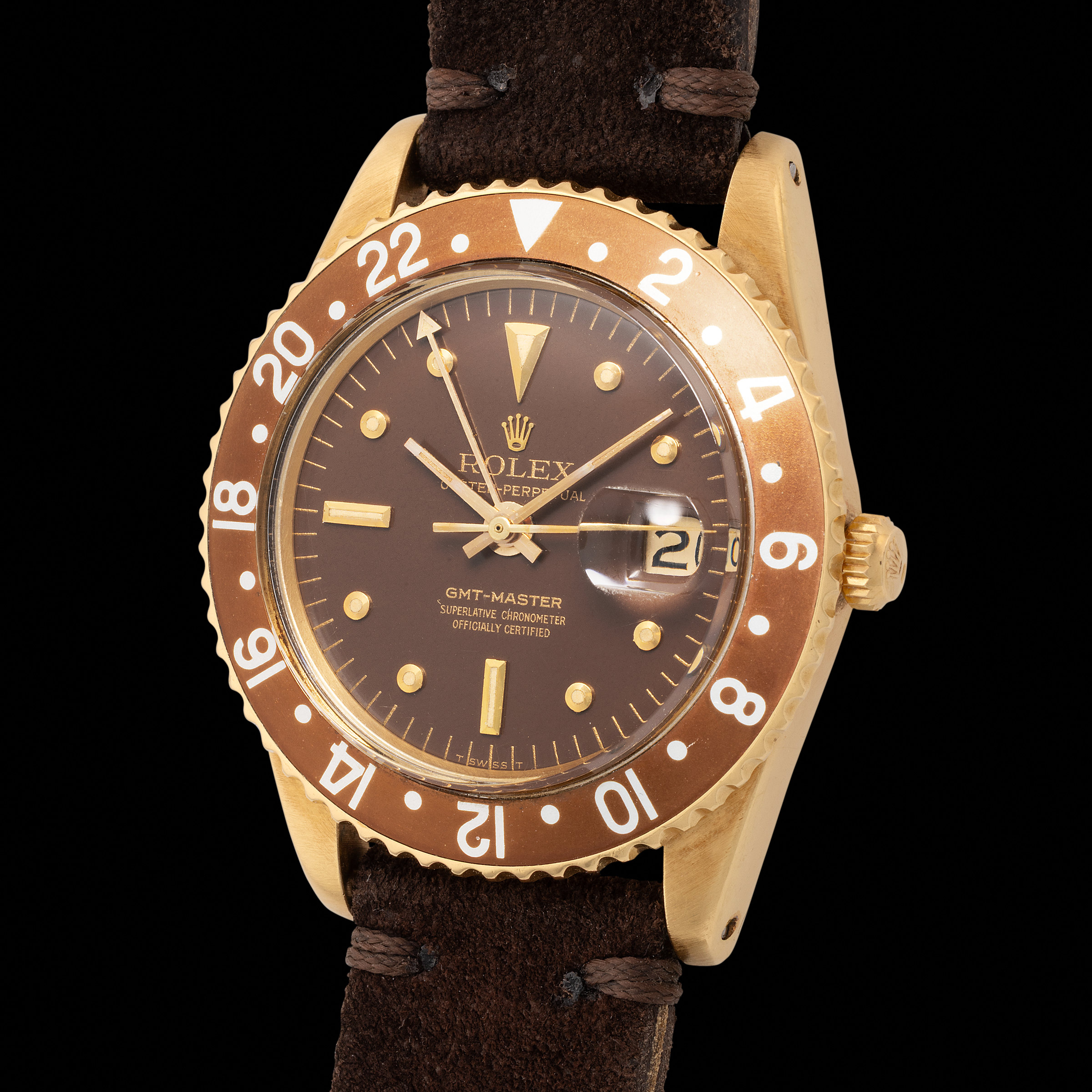 The earliest gold iterations present fascinating differences when compared to their steel counterparts, most notably the absence of crown guards, a detail soon adopted across the range. The present specimen showcases a highly charming glossy brown dial, identified by the distinctive hyphen in “OYSTER–PERPETUAL” and the clean “T.SWISS.T” designation at 6 o’clock. Equally evocative are the distinctive "baton-shaped hands, paired with the celebrated “nipple” indexes that have become a hallmark of vintage golden GMT-Masters.