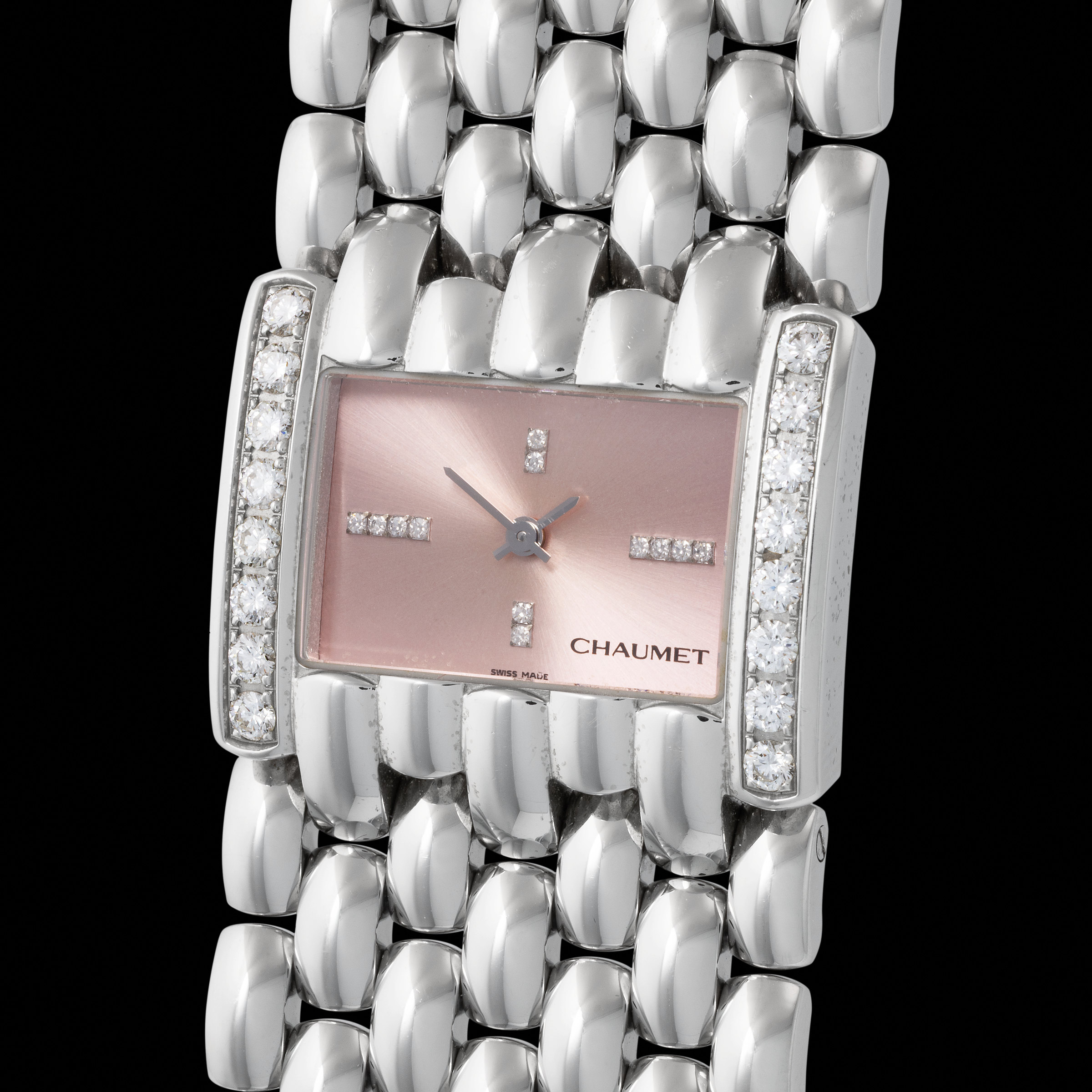 The present example, sized in the rare and more substantial XL case format, features a soft pink dial adorned with brilliant-cut diamond hour markers and flanked by diamond-set vertical sides, subtle yet striking elements that elevate its presence on the wrist. The minimalism of the dial, marked only by the Chaumet signature and diamond-set indices at the cardinal points, further underscores the Maison’s philosophy of refined restraint.