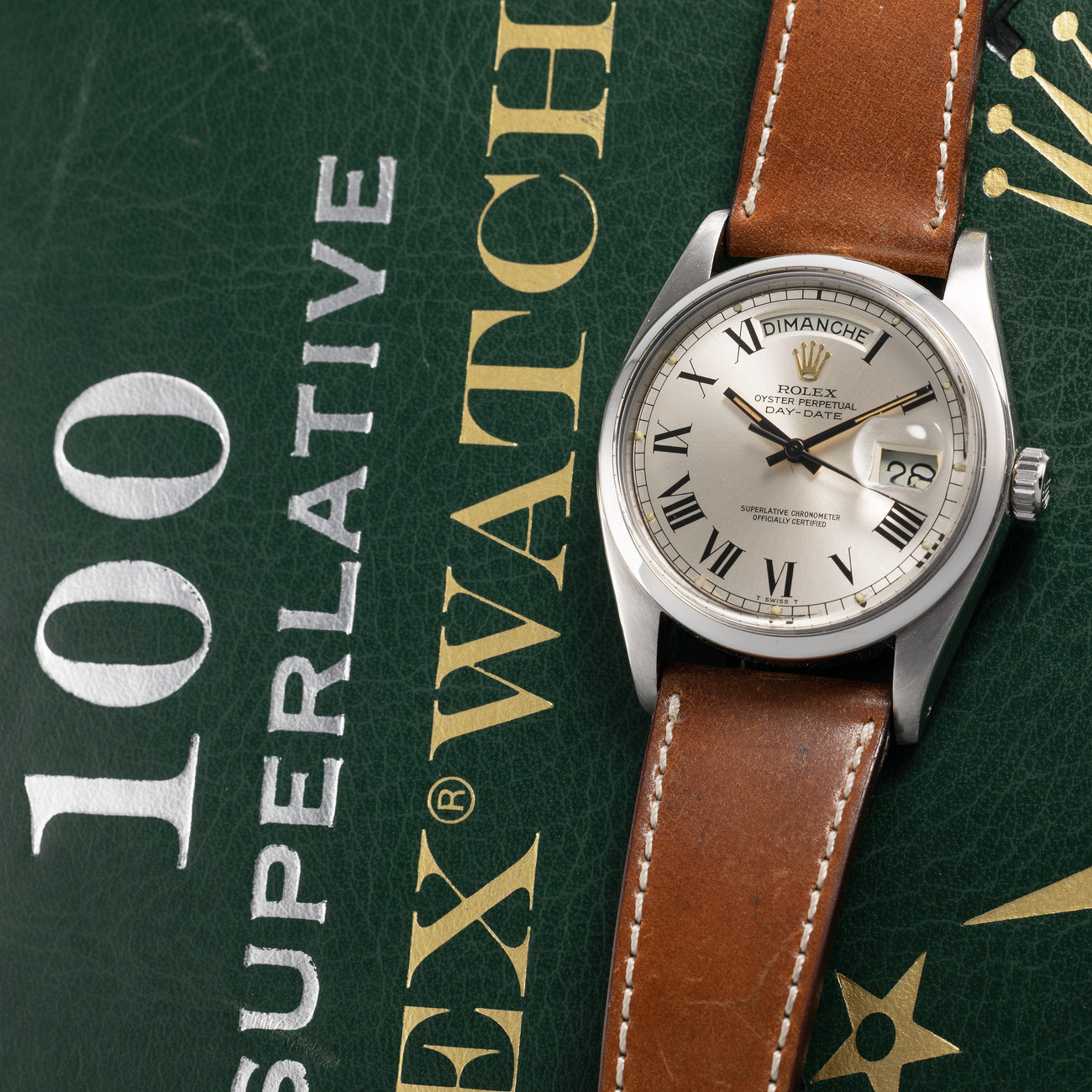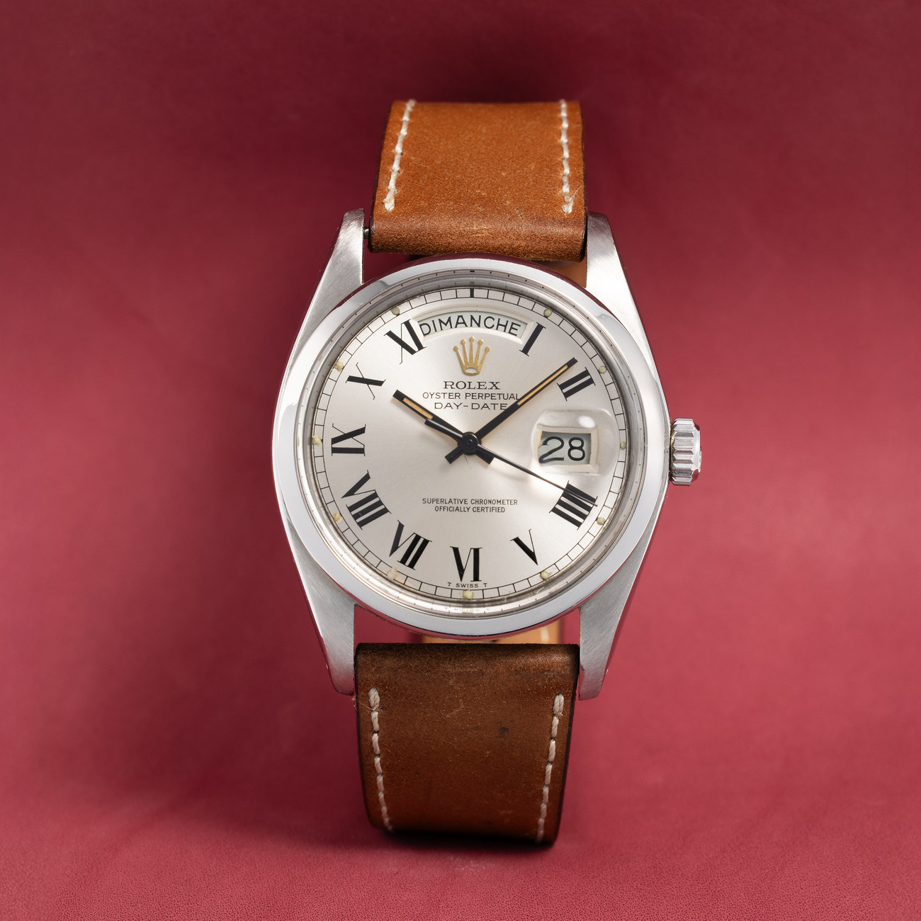 Crafted in stainless steel, this Day-Date was created to test the introduction of the quick-set date function, a feature that would revolutionize the model and is still found on modern sapphire-crystal Day-Dates. It houses calibre 3035, the movement that became the foundation for all automatic Rolex watches from 1977 onwards.