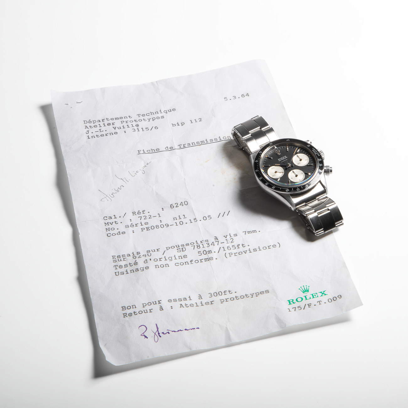 Accompanying the watch is a 1964 official Fiche de Transmission from Rolex’s prototype department, documenting its role in the waterproof trials. The case bears no serial or reference numbers, a hallmark of a true prototype, with the case back engraved only with an internal workshop code.